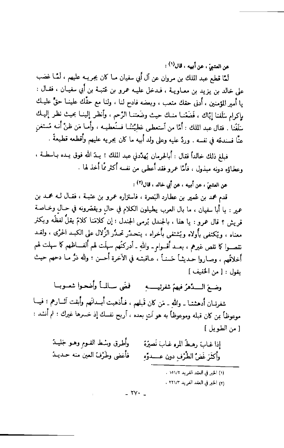 عن العتبيّ، عن أبيه، قال: لمّا قطع عبد الملك بن مروان عن آل أبي سفيان ما كان يجريه عليهم، لمّا غضب على خالد بن يزيد بن معاوية، فدخل عليه عمرو بن عتبة بن أبي سفيان، فقال: يا أمير المؤمنين، أدنى حقك متعب، وبعضه فادح لنا، ولنا مع حقّك حقّ عليك بإكرام سلفنا إيّاك، فضعنا منك حيث وضعتنا الرّحم، وانظر إلينا بحيث نظر إليك سلفنا. فقال عبد الملك: أمّا من استعصى عطيّتنا فسنعطيه، وأمّا من ظنّ أنه مستغن عنّا فسندعه في نفسه. وردّ عليه وعلى ولد أبيه ما كان يجريه عليهم وأقطعه قطيعةً. فبلغ ذلك خالداً فقال: أبا لحرمان يهدّدني عبد الملك؟؟؟؟؟؟! يد الله فوق يده باسطة، وعطاؤه دونه مبذول، فأمّا عمرو فقد أعطى من نفسه أكثر مّما أخذ لها.