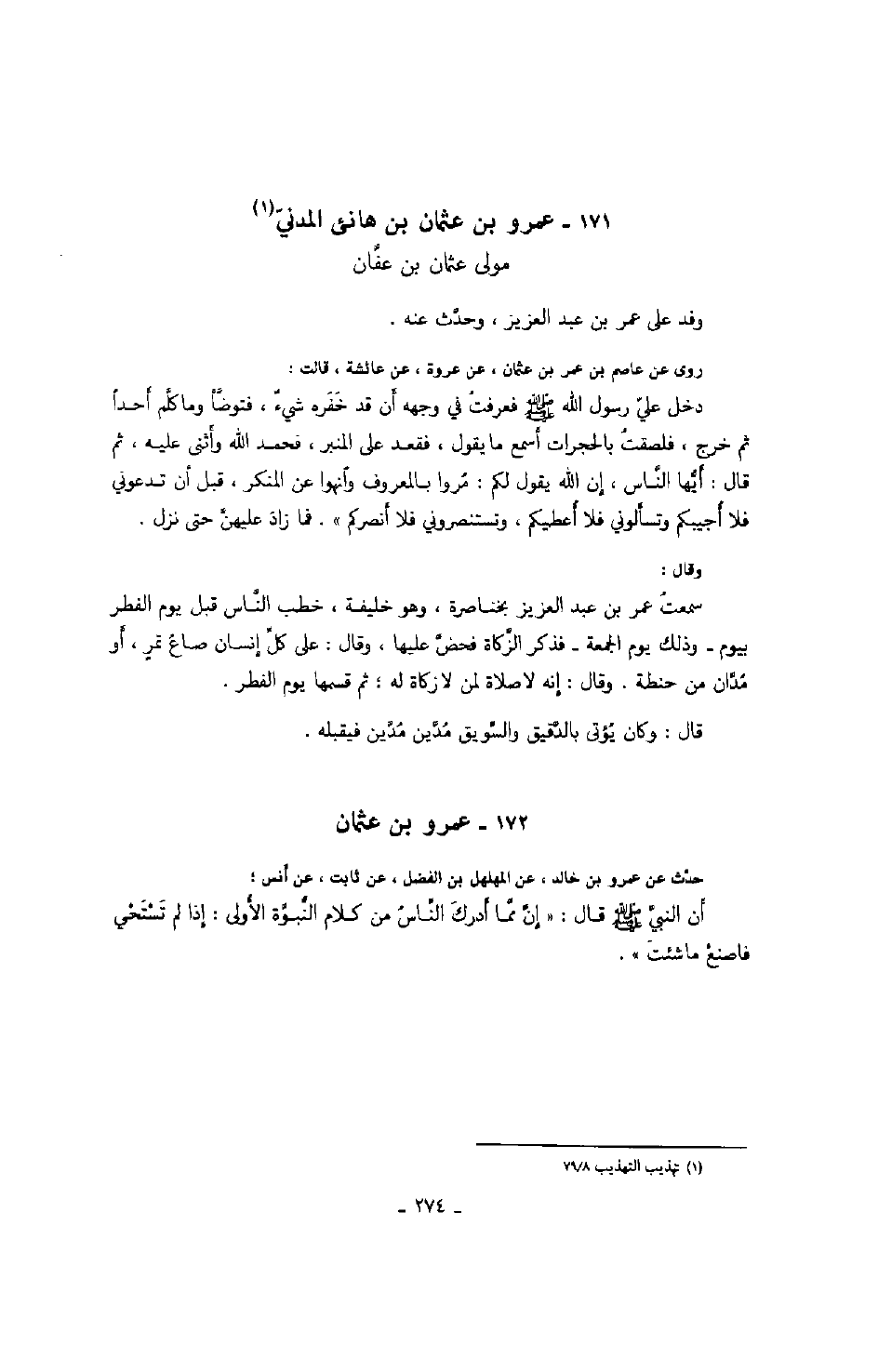 روى عن عاصم بن عمر بن عثمان، عن عروة، عن عائشة، قالت: دخل عليّ رسول الله صَلَّى اللهُ عَلَيْهِ وَسَلَّمَ فعرفت في وجهه أن قد خفره شيء، فتوضّأ وما كلّم أحداً ثم خرج، فلصقت بالحجرات أسمع ما يقول، فقعد على المنبر، فحمد الله وأثنى عليه، ثم قال: أيّها النّاس، إن الله يقول لكم: مروا بالمعروف وانهوا عن المنكر، قبل أن تدعوني فلا أجيبكم وتسألوني فلا أعطيكم، وتستنصروني فلا أستنصركم ". فما زاد عليهنّ حتى نزل. وقال: سمعت عمر بن عبد العزيز بخناصرة، وهو خليفة، خطب النّاس قبل يوم الفطر بيوم وذلك يوم الجمعة فذكر الزّكاة فحضّ عليها، وقال: على كلّ إنسان صاع تمر، أو مدّان من حنطة. وقال: إنه لاصلاة لمن لا زكاة له؛ ثم قسمها يوم الفطر. قال: وكان يؤتى بالدّقيق والسّويق مدّين مدّين فيقبله.
