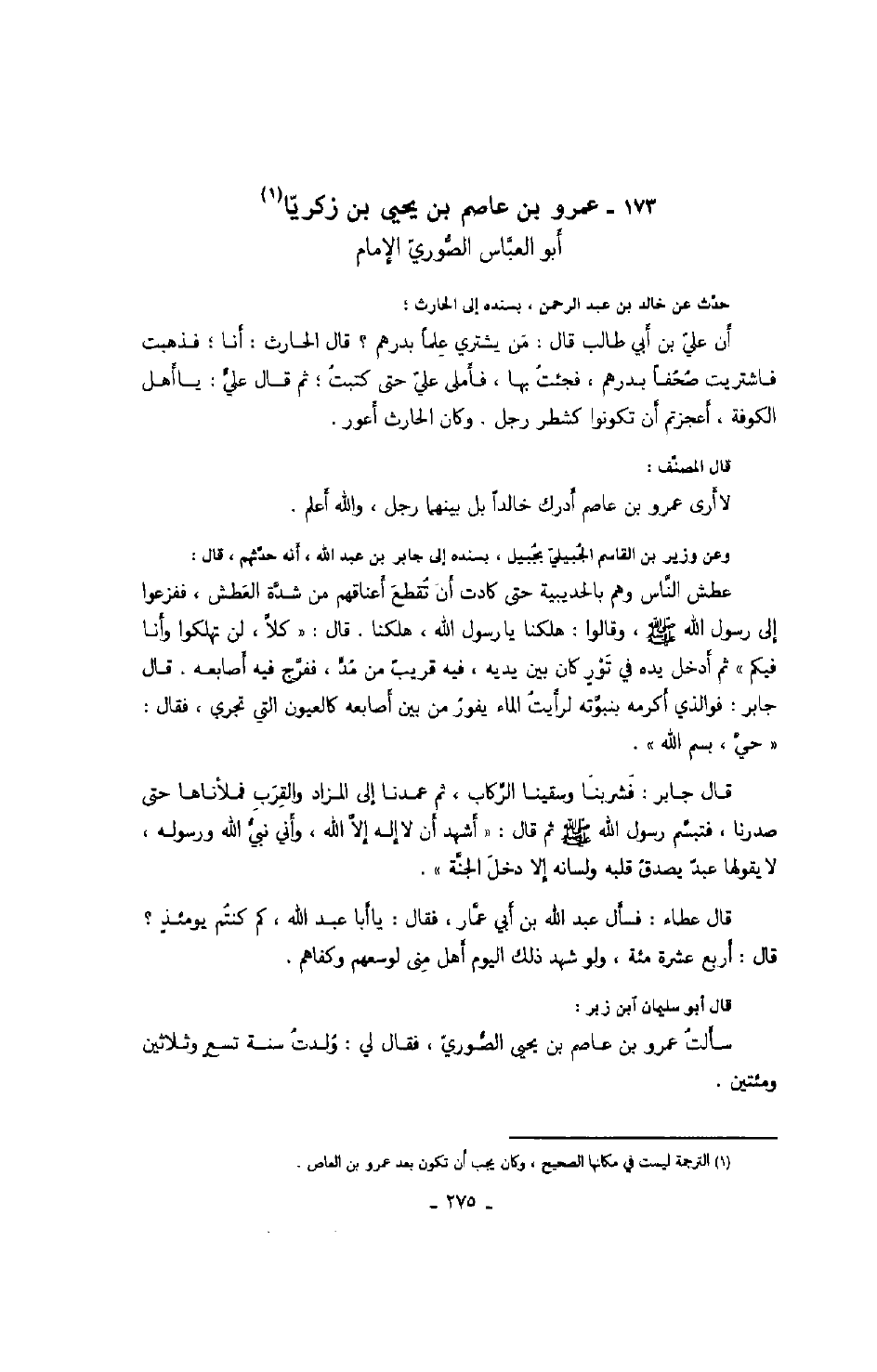 وعن وزير بن القاسم الجبيليّ بجبيل، بسنده إلى جابر بن عبد الله، أنه حدّثهم، قال: عطش النّاس وهم بالحديبية حتى كادت أن تقطع أعناقهم من شدّة العطش، ففزعوا إلى رسول الله صَلَّى اللهُ عَلَيْهِ وَسَلَّمَ، وقالوا: هلكنا يا رسول الله، هلكنا. قال: " كلاّ، لن تهلكوا وأنا فيكم " ثم أدخل يده في تور كان بين يديه، فيه قريب من مدّ، ففرّج فيه أصابعه. قال جابر: فوالذي أكرمه بنبوّته لرأيت الماء يفور من بين أصابعه كالعيون التي تجري، فقال: " حيّ، بسم الله ". قال جابر: فشربنا وسقينا الرّكاب، ثم عمدنا إلى المزاد والقرب فملأناها حتى صدرنا، فتبسّم رسول الله صَلَّى اللهُ عَلَيْهِ وَسَلَّمَ ثم قال: " أشهد أن لا إله إلاّ الله، وأني نبيّ الله ورسوله، لا يقولها عبد يصدق قلبه ولسانه إلا دخل الجنّة ". قال عطاء: فسأل عبد الله أبي عمّار، فقال: يا أبا عبد الله، كم كنت يومئذ؟ قال: أربع عشرة مئة، ولو شهد ذلك اليوم أهل منى لوسعهم وكفاهم. قال أبو سليمان ابن زبر: سألت عمرو بن عاصم بن يحيى الصّوريّ، فقال لي: ولدت سنة تسع وثلاثين ومئتين.