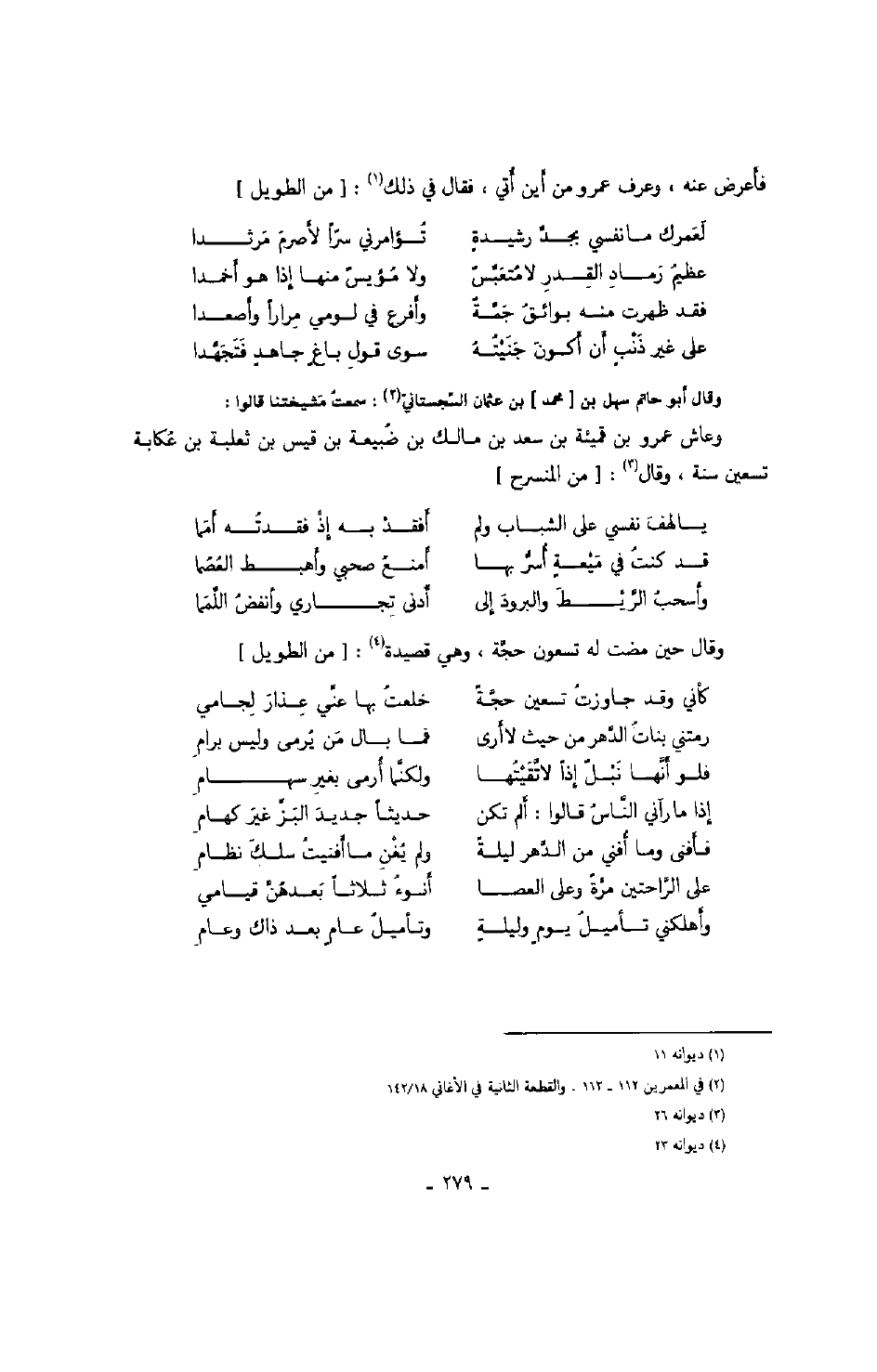 وقال أبو حاتم سهل بن محمد بن عثمان السّجستانيّ: سمعت مشيختنا قالوا: وعاش عمرو بن قميئة بن سعد بن مالك بن ضبيعة بن قيس بن ثعلبة بن عكابة تسعين سنة، وقال: من المنسرح