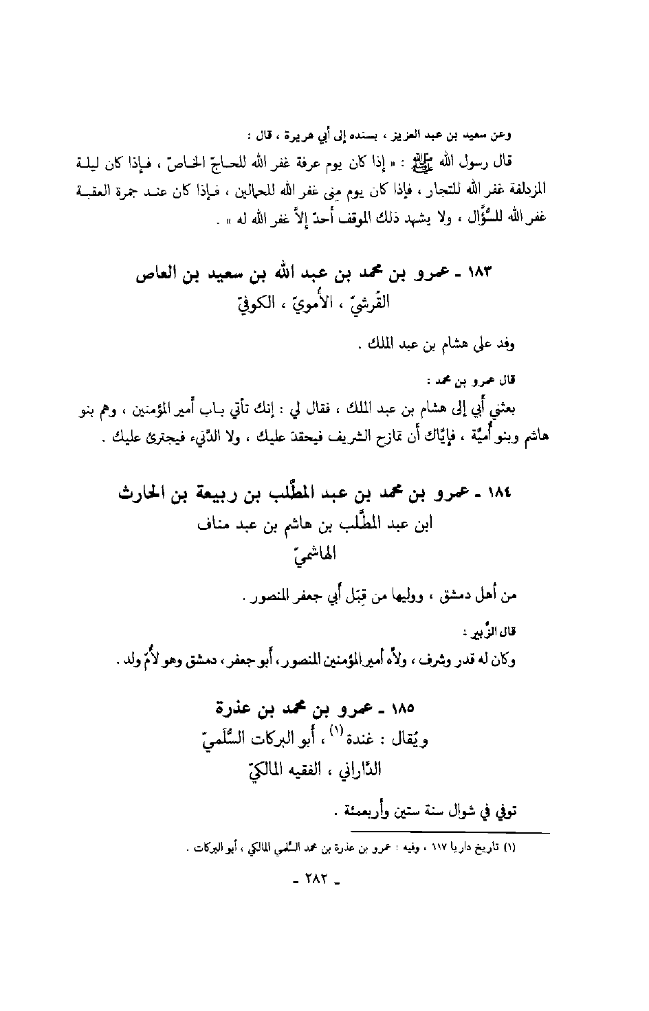 وعن سعيد بن عبد العزيز، بسنده إلى أبي هريرة، قال: قال رسول الله صَلَّى اللهُ عَلَيْهِ وَسَلَّمَ: " إذا كان يوم عرفة غفر الله للحاج الخاصّ، فإذا كان ليلة المزدلفة فغر الله للتجار، فإذا كان يوم منى غفر الله للحمالين، فإذا كان عند جمرة العقبة غفر الله للسؤّال، ولا يشهد ذلك الموقف أحد إلاّ غفر الله له ".