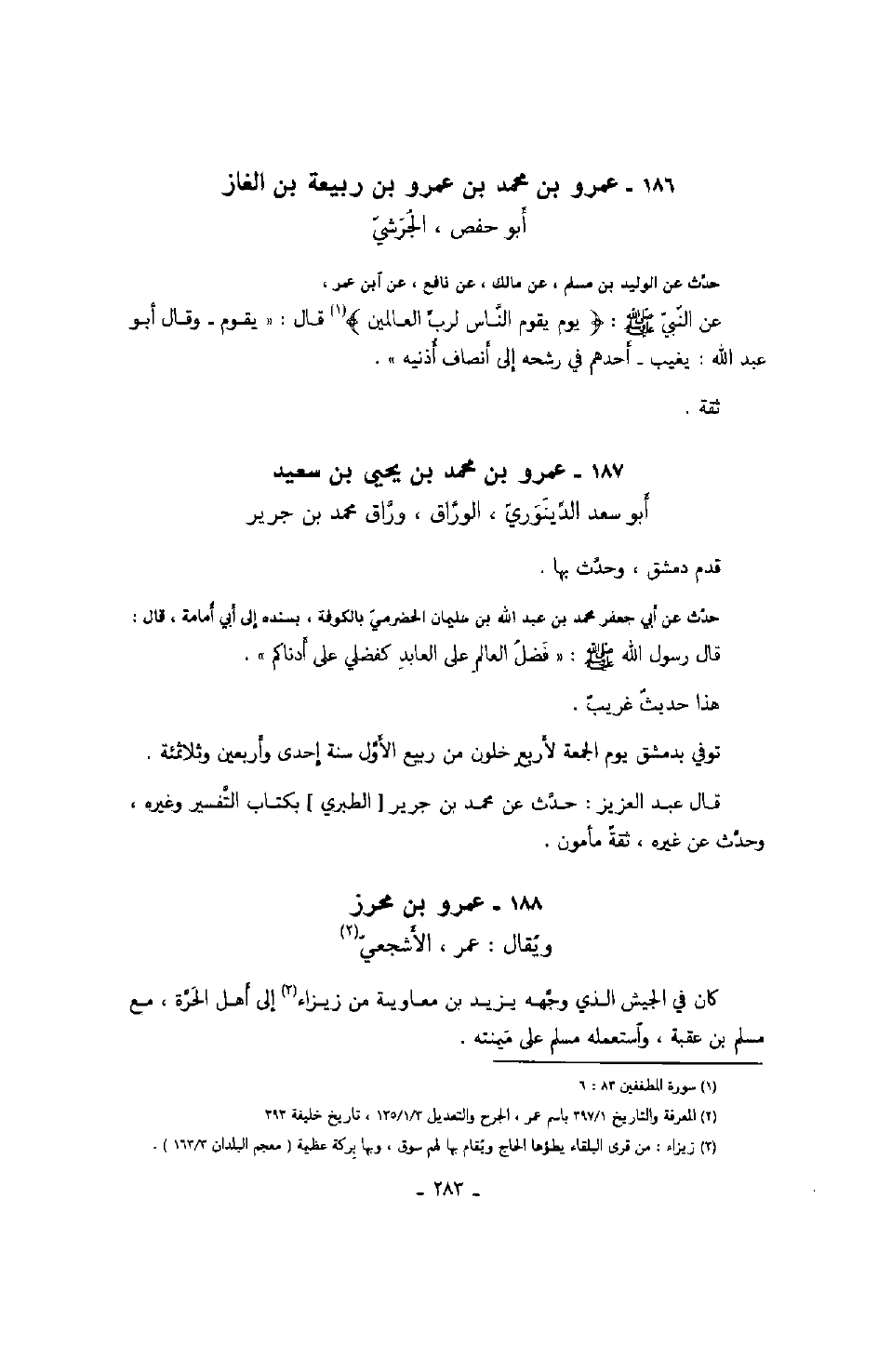 ابن ربيعة بن الغاز أبو حفص، الجرشيّ حدّث عن الوليد بن مسلم، عن مالك، عن نافع، عن ابن عمر، عن النّبيّ صَلَّى اللهُ عَلَيْهِ وَسَلَّمَ: " يوم يقوم النّاس لرّب العالمين " قال: " يقوم وقال أبو عبد الله: يغيب أحدهم في رشحه إلى أنصاف أذنيه ". ثقة.