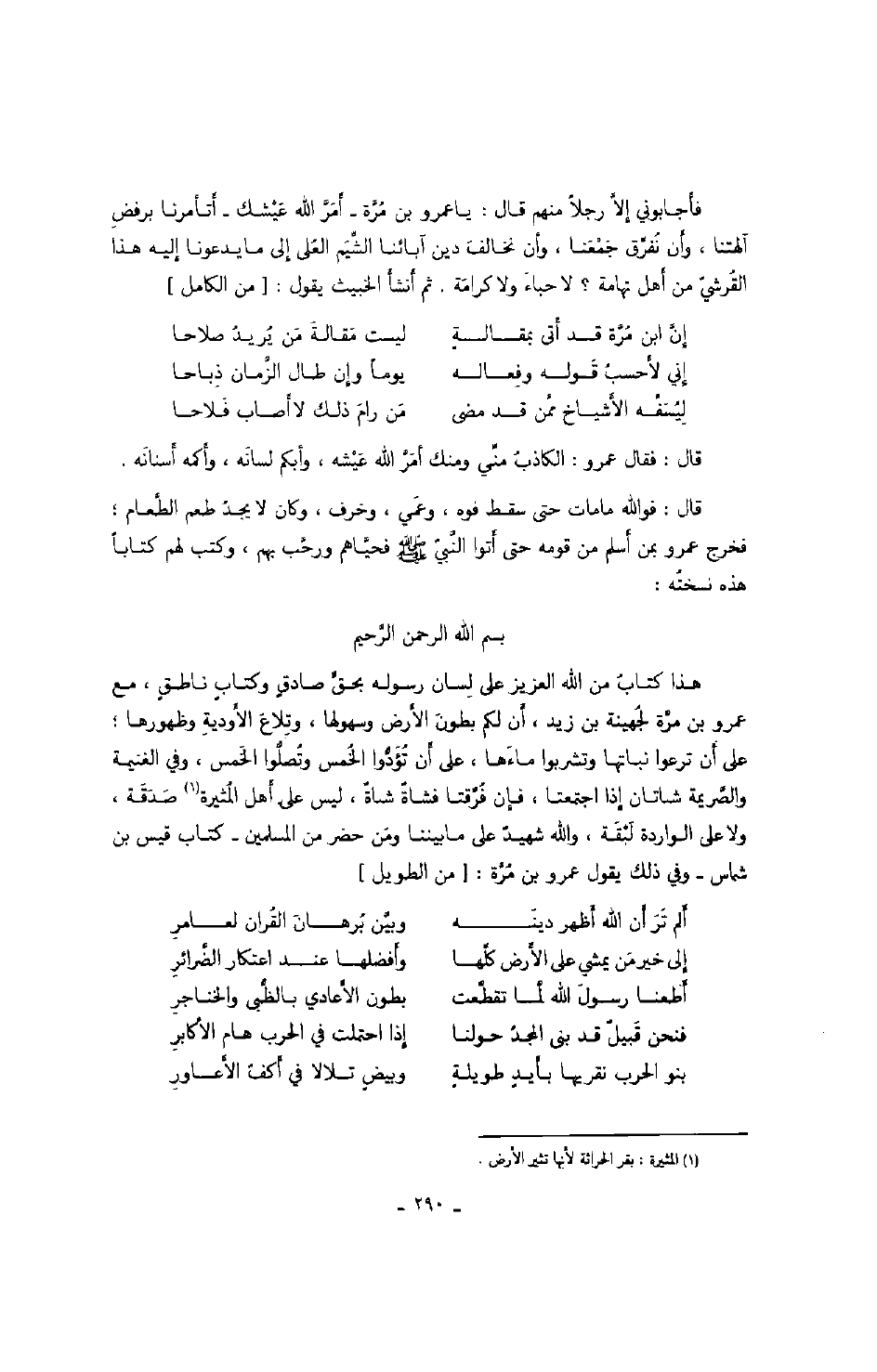 قال: فوالله مامات حتى سقط فوه، وعمي، وخرف، وكان لا يجد طعم الطّعام؛ فخرج عمرو بمن أسلم من قومه حتى أتوا النّبيّ صَلَّى اللهُ عَلَيْهِ وَسَلَّمَ فحيّاهم ورحبّ بهم، وكتب لهم كتاباً هذه نسخته: " بسم الله الرحمن الرّحيم " هذا كتاب من الله العزيز على لسان رسوله بحقّ صادق وكتاب ناطق، مع عمرو بن مرّة لجهينه بم زيد، أن لكم بطون الأرض وسهولها، وتلاع الأودية وظهورها؛ على أن ترعوا نباتها وتشربوا ماءها، على أن تؤدّوا الخمس وتصلّوا الخمس، وفي الغنيمة والصّريمة شاتان إذا اجتمعا، فإن فرّقتا فشاة شاة، ليس على أهل المثيرة صدقة، ولا على الواردة لبقة، والله شهيد على ما بيننا ومن حضر من المسلمين كتاب قيس بن شماس وفي ذلك يقول عمرو بن مرّة: من الطويل