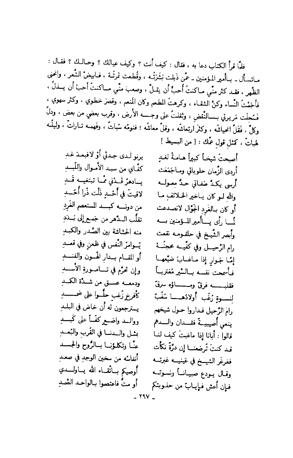 فلّما قرأ الكتاب دعا به، فقال: كيف أنت؟ وكيف عيالك؟ وحالك؟ فقال: ما تسأل يا أمير المؤمنين عمّن ذبلت بشرته، وقطعت ثمرته، فابيضّ الشّعر، وانحنى الظّهر، فقد كثر منّي ما منت أحبّ أن يقلّ، وصعب منّي ما كنت أحبّ أن يذلّ، فأجمت النّساء وكنّ الشقاء، وكرهت المطعم وكان المنعم، وقصر خطوي، وكثر سهوي، فسحلت مريرتي بالنّقض، وشقلت على وجه الأرض، وقرب بعضي من بعض، ودّل وكلّ، فقلّ انحياشه، وكثر ارتعاشه، وقلّ معاشه؛ فنومه سبات، وفهمه تارات، وليله هبات، كمثل قول عمّك: من البسيط