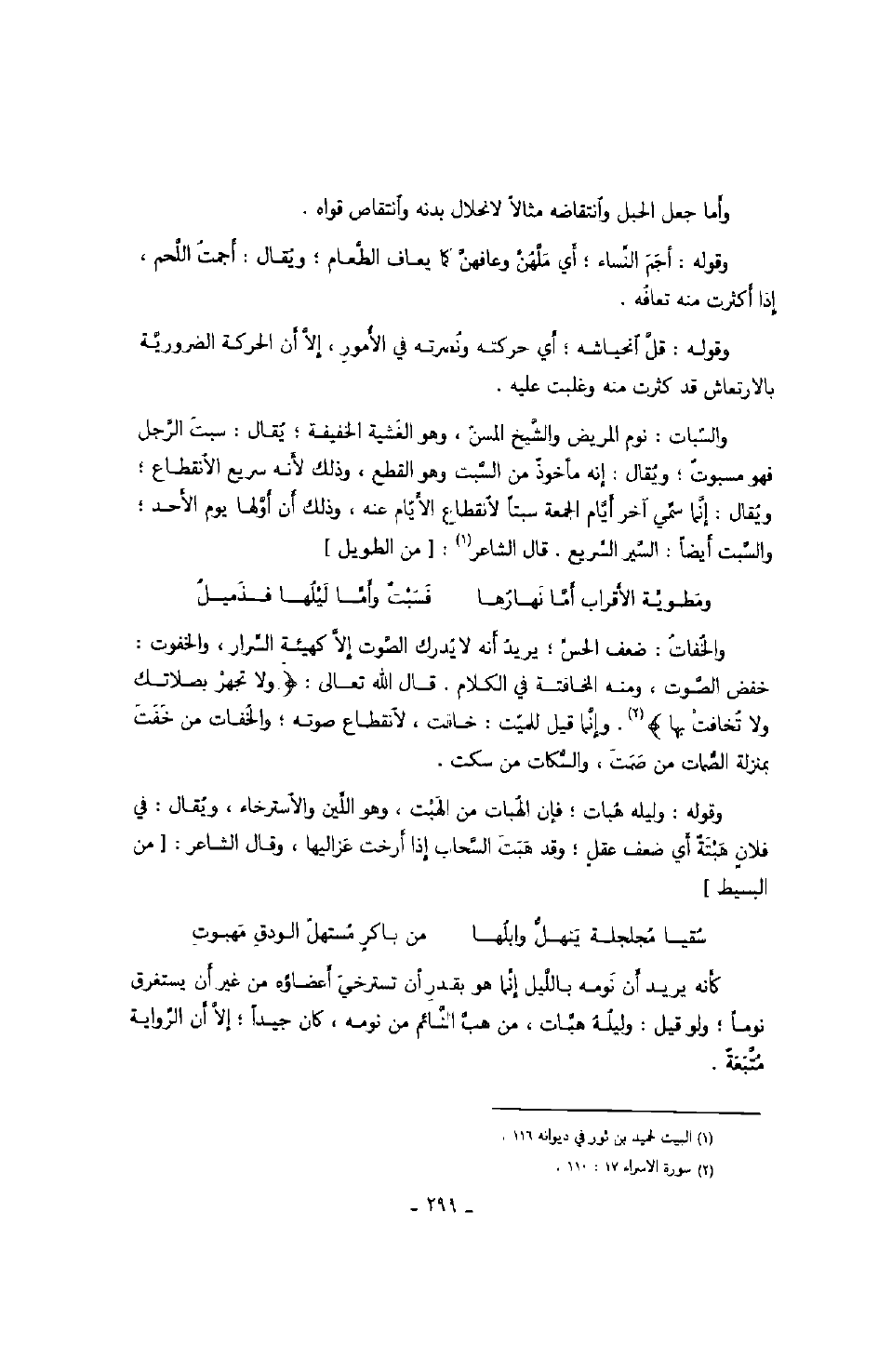 وقوله: قلّ انحياشه؛ أي حركته ونصرته في الأمور، إلاّ أن الحركة الضروريّة بالارتعاش قد كثرت منه وغلبت عليه. والسّبات: نوم المريض والشّيخ المسنّ، وهو الغشية الخفيقة؛ يقال: سبت الرّجل فهو مسبوت؛ ويقال: إنه مأخوذ من السّبت وهو القطع، وذلك لأنه سريع الانقطاع؛ ويقال: إنّما سمّي آخر أيّام الجمعة سبتاً لانقطاع الأيّام عنه، وذلك أن أوّلها يوم الأحد؛ والسّبت أيضاً: السّير السّريع. قال الشاعر: من الطويل