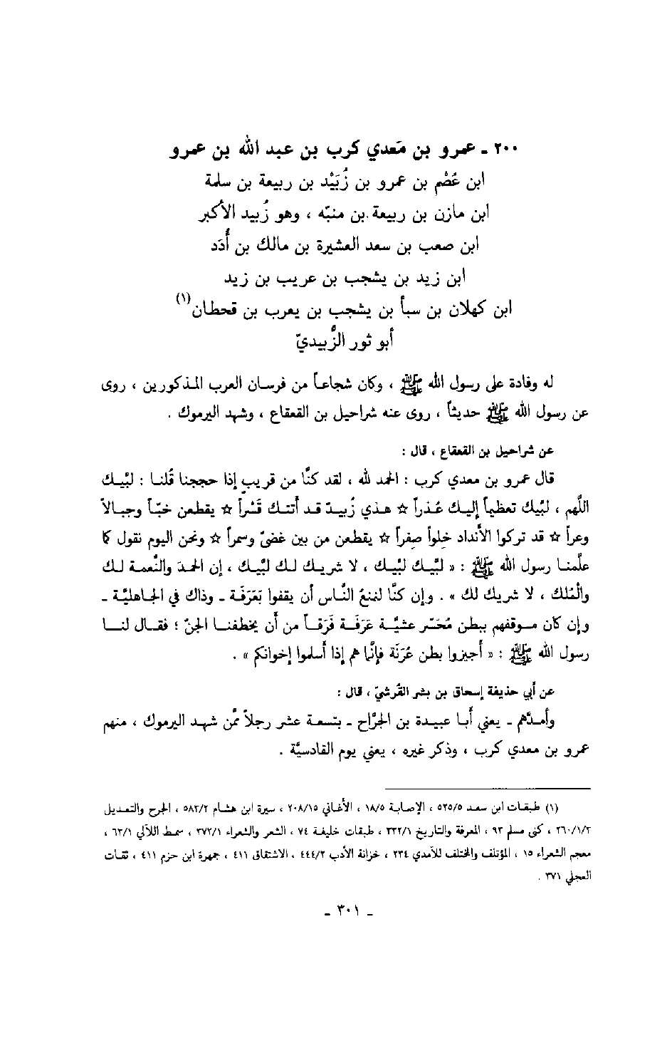 عن شراحيل بن القعقاع، قال: قال عمرو بن معدي كرب: الحمد لله، لقد كنّا من قريب إذا حججنا قلنا: لبّيك اللهم، لبّيك تعظيماً إليك عذراً، هذي زبيد قد أتتك قسراً، يقطعن خبّاً وجبالاً وعراً، قد تركوا الأنداد خلواً صفراً، يقطعن من بين غضىً وسمراً، ونحن اليوم نقول كما علّمنا رسول الله صَلَّى اللهُ عَلَيْهِ وَسَلَّمَ: " لبّيك لبّيك، لا شريك لك لبّيك، إن الحمد والنّعمة لك والملك، لا شريك لك ". وإن كنّا لنمنع النّاس أن يقفوا بعرفة وذاك في الجاهليّة وإن كان موقفهم ببطن محسّر عشيّة عرفة فرقاً من أن يخطفنا الجنّ؛ فقال لنا رسول الله صَلَّى اللهُ عَلَيْهِ وَسَلَّمَ: " أجيزوا بطن عرنة فإنّما هم إذا أسلموا إخوانكم ".