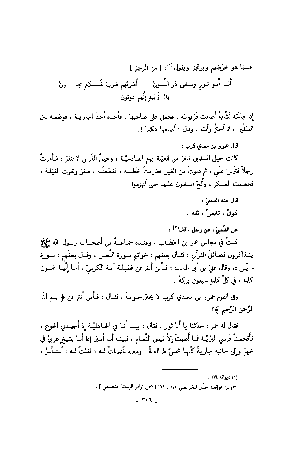 إذ جاءته نشّابة أصابت قربوسه، فحمل على صاحبها، فأخذه أخذ الجارية، فوضعه بين الصّفّين، ثم احتزّ رأسه، وقال: اصنعوا هكذا! قال عمرو بن معدي كرب: كانت خيل المسلمين تنفر من الفيلة يوم القادسيّة، وخيل الفرس لا تنفر؛ فأمرت رجلاً فتّرس عنّي، ثم دنوت من الفيل فضربت خطمه، فقطعته، فنفر ونفرت الفيلة، فحطمت العسكر، وألحّ المسلمون عليهم حتى انهزموا.
