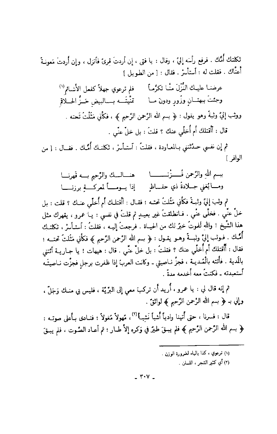 ثم وثب إليّ وثبة فكأني مثلت تحته؛ فقال: أأقتلك أم أخلّي عنك؟ قلت: بل خلّ عنّي. فخلّى عنّي. فانطلقت غير بعيد ثم قلت في نفسي: يا عمرو، يقهرك مثل هذا الشّيخ! والله للموت خير لك من الحياة. فرجعت إليه، فقلت: استأسر، ثكلتك أمّك. فوثب إليّ وثبة وهو يقول: " بسم الله الرّحمن الرّحيم " فكأني مثلت تحته، فقال: أأقتلك أم أخلّي عنك؟ فقلت: بل خلّ عنّي. قال: هيهات! يا جارية ائتني بالمدية. فأتته بالمدية، فجزّ ناصيتي وكانت العرب إذا ظفرت برجل فجزّت ناصيته استعبدته فكنت معه أخدمه مدةً. ثم إنه قال لي: يا عمرو، أريد أن تركب معي إلى البرّيّة، فليس بي منك وجل، وإني ب " بسم الله الرّحمن الرّحيم " لواثق. قال: فسرنا، حتى أتينا وادياً أشبا نشبا، مهولاً مغولاً؛ فنادى بأعلى صوته: " بسم الله الرّحمن الرّحيم " فلم يبق طير في وكره إلاّ طار؛ ثم أعاد الصّوت، فلم يبق
