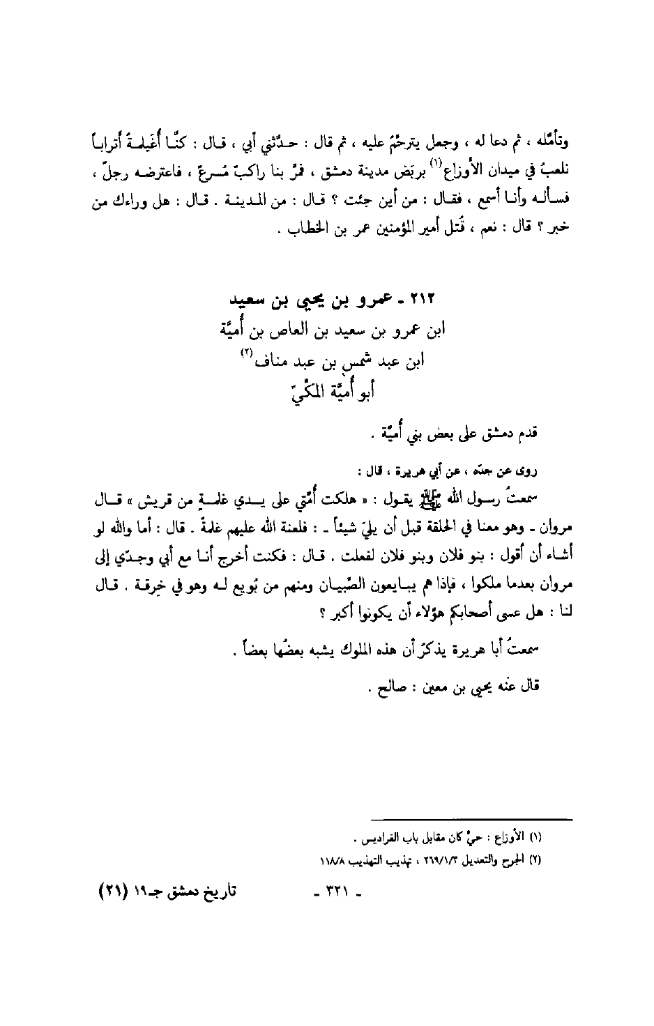 وتأمّله، ثم دعا له، وجعل يترحّم عليه، ثم قال: حدّثني أبي، قال: كنّا أغيلمة أتراباً نلعب في ميدان الأوزاع بربض مدينة دمشق، فمّر بنا راكب مسرع، فاعترضه رجل، فسأله وأنا أسمع، فقال: من أين جئت؟ قال: من المدينة. قال: هل وراءك من خبر؟ قال: نعم، قتل أمير المؤمنين عمر بن الخطّاب.