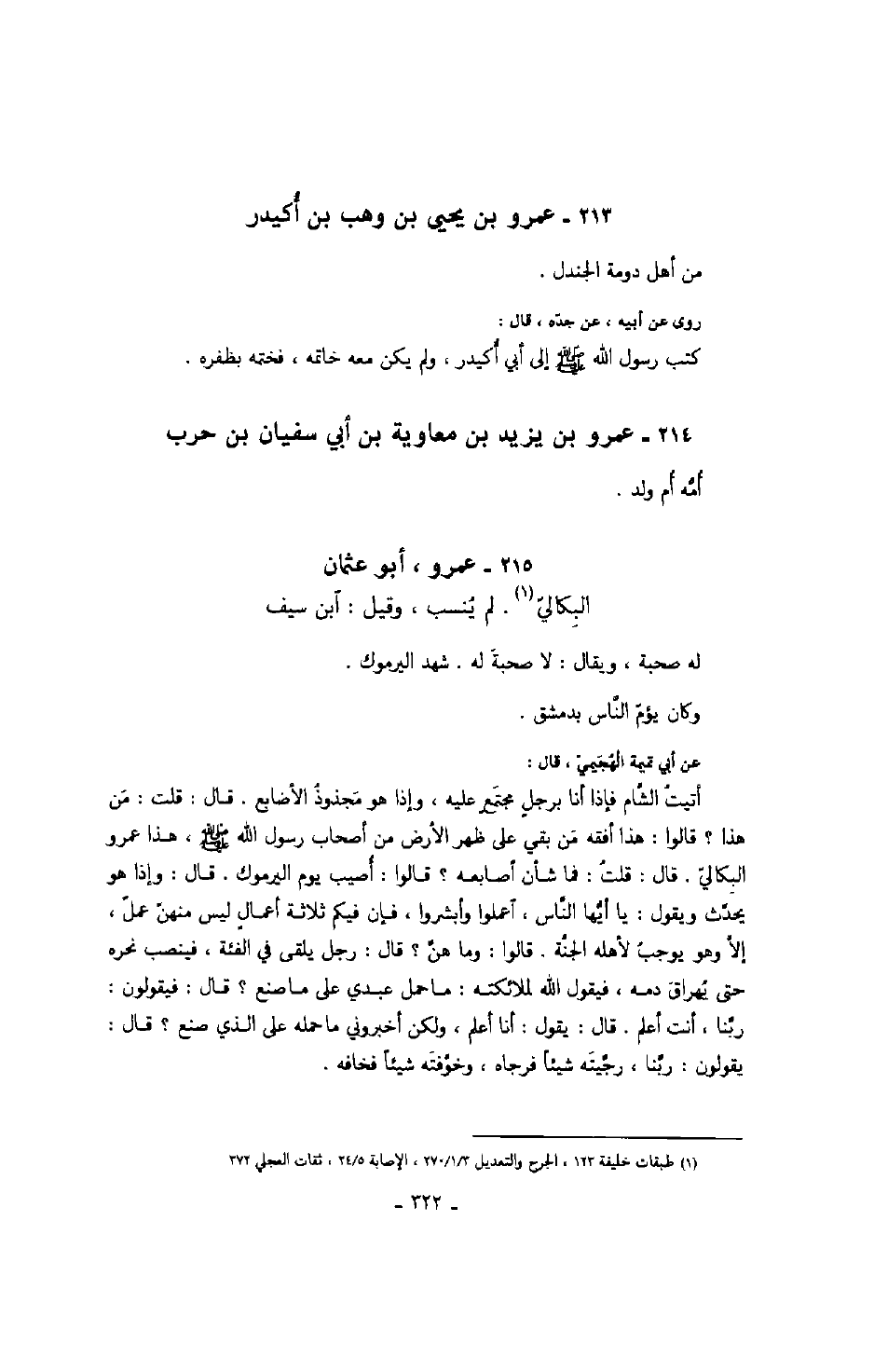 عن أبي تميمية الهجيمي، قال: أتيت الشّام فإذا أنا برجل مجتمع عليه، وإذا هو مجذوذ الأصابع. قال: قلت: من هذا؟ قالوا: هذا أفقه من بقي على ظهر الأرض من أصحاب رسول الله صَلَّى اللهُ عَلَيْهِ وَسَلَّمَ، هذا عمرو البكاليّ. قال: قلت: فما شأن أصابعه؟ قالوا: أصيب يوم اليرموك. قال: وإذا هو يحدّث ويقول: يا أيّها النّاس، اعملوا وأبشروا، فإن فيكم ثلاثة أعمال ليس منهنّ عمل، إلاّ وهو يوجب لأهله الجنّة، قالوا: وما هنّ؟ قال: رجل يلقى في الفئة، فينصب نحره حتى يهراق دمه، فيقول الله لملائكته: ما حمل عبدي على ما صنع؟ قال: فيقولون: ربّنا، أنت أعلم. قال: يقول: أنا أعلم، ولكن أخبروني ما حمله على الذي صنع؟ قال: يقولون: ربّنا، رجّيته شيئاً فرجاه، وخوّفته شيئاً فخافه.