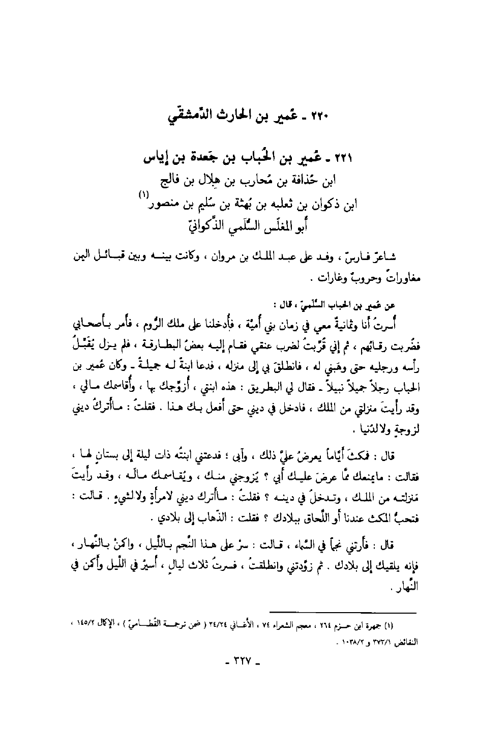 عن عمير بن الحباب السّلميّ، قال: أسرت أنا وثمانية معي في زمان بني أميّة، فأدخلنا على ملك الرّوم، فأمر بأصحابي فضربت رقابهم، ثم إني قرّبت لضرب عنقي فقام إليه بعض البطارقة، فلم يزل يقبّل رأسه ورجليه حتى وهبني له، فانطلق بي إلى منزله، فدعا ابنةً له جميلة وكان عمير بن الحباب رجلاً جميلاً نبيلاً فقال لي البطريق: هذه ابنتي، أزوّجك بها، وأقاسمك مالي، وقد رأيت منزلي من الملك، فادخل في ديني حتى أفعل بك هذا. فقلت: ما أترك ديني لزوجة ولا لدنيا. قال: فمكث أيّاماً يعرض عليّ ذلك، وآبى؛ فدعتني ابنته ذات ليلة إلى بستان لها، فقالت: ما يمنعك ممّا عرض عليك أبي؟ يزوجني منك، ويقاسمك ماله، وقد رأيت منزلته من الملك، وتدخل في دينه؟ فقلت: ما أترك ديني لامرأة ولا لشيء. قالت: فتحبّ المكث عندنا أو اللّحاق ببلادك؟ فقلت: الذّهاب إلى بلادي. قال: فأرتني نجماً في السّماء، قالت: سر على هذا النّجم باللّيل، واكمن بالنّهار، فإنه يلقيك إلى بلادك. ثم زوّدتني وانطلقت، فسرت ثلاث ليال، أسير في اللّيل وأكمن في النّهار.