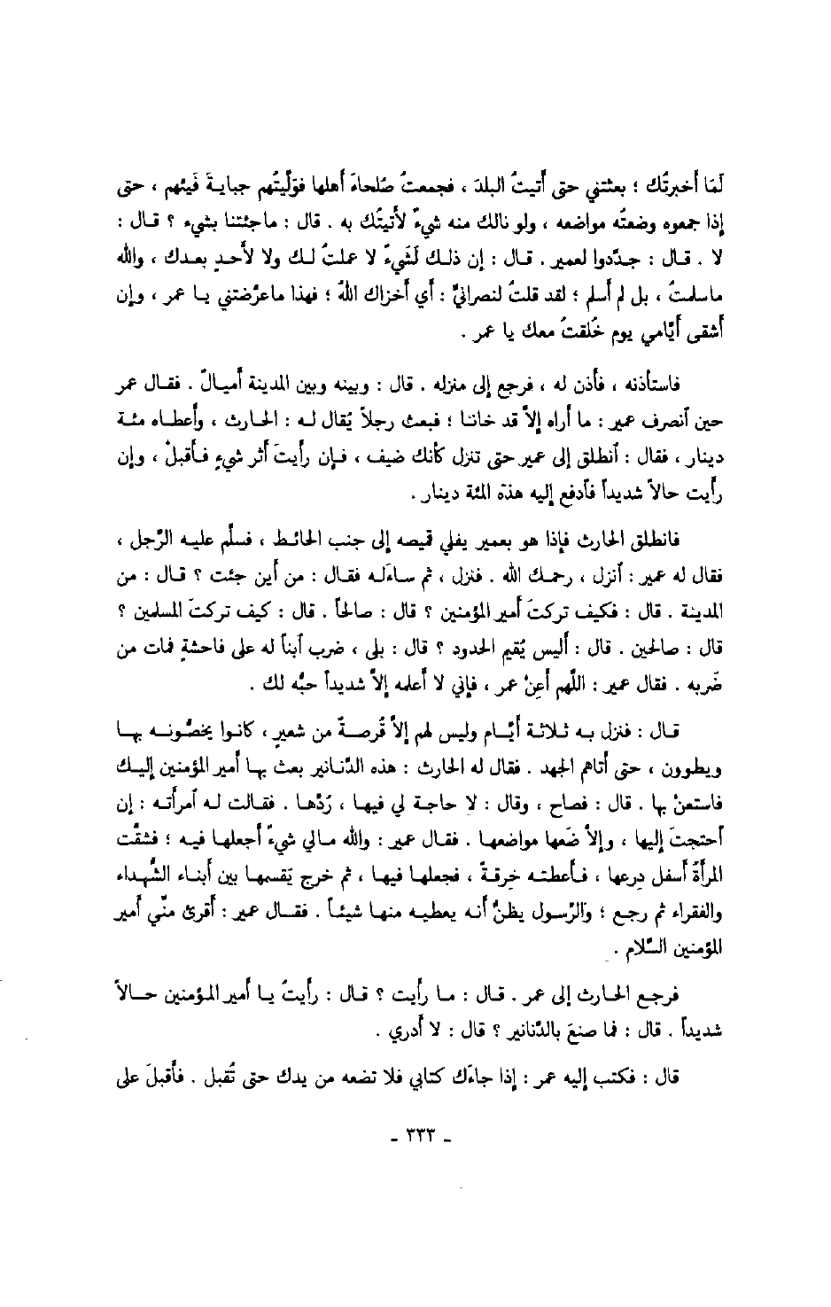 لما أخبرتك؛ بعثتني حتى أتيت البلد، فجمعت صلحاء أهلها فولّيتهم جباية فيئهم، حتى إذا جمعوه وضعته مواضعه، ولو نالك منه شيء لأتيتك به. قال: ما جئتنا بشيء؟ قال: لا. قال: جدّدوا لعمير. قال: إن ذلك لشيء لا عملت لك ولا لأحد بعدك، والله ما سلمت، بل لم أسلم؛ لقد قلت لنصرانيّ: أي أخزاك الله؛ فهذا ما عرّضتني يا عمر، وإن أشقى أيّامي يوم خلقت معك يا عمر. فاستأذنه، فأذن له، فرجع إلى منزله. قال: وبينه وبين المدينة أميال. فقال عمر حين انصرف عمير: ما أراه إلاّ قد خاننا؛ فبعث رجلاً يقال له: الحارث، وأعطاه مئة دينار، فقال: انطلق إلى عمير حتى تنزل كأنك ضيف، فإن رأيت أثر شيء فأقبل، وإن رأيت حالاً شديداً فادفع إليه هذه المئة دينار. فانطلق الحارث فإذا هو بعمير يفلي قميصه إلى جنب الحائط، فسلّم عليه الرّجل، فقال له عمير: انزل، رحمك الله. فنزل، ثم سأله فقال: من أين جئت؟ قال: من المدينة. قال: فكيف تركت أمير المؤمنين؟ قال: صالحاً. قال: كيف تركت المسلمين؟ قال: صالحين. قال: أليس يقيم الحدود؟ قال: بلى، ضرب ابناً له على فاحشة فمات من ضربه. فقال عمير: اللهم أعن عمر، فإني لا أعلمه إلاّ شديداً حبّه لك. قال: فنزل به ثلاثة أيّام وليس لهم إلاّ قرصة من شعير، كانوا يخصّونه بها ويطوون، حتى أتاهم الجهد. فقال له الحارث: هذه الدّنانير بعث بها أمير المؤمنين إليك فاستعن بها. قال: فصاح، وقال: لا حاجة لي فيها، ردّها. فقالت له امرأته: إن احتجت إليها، وإلاّ ضعها مواضعها. فقال عمير: والله ما لي شيء أجعلها فيه؛ فشقّت المرأة أسفل درعها، فأعطته خرقة، فجعلها فيها، ثم خرج يقسمها بين أبناء الشّهداء والفقراء ثم رجع؛ والرّسول يظنّ أنه يعطيه منها شيئاً. فقال عمير: أقرئ منّي أمير المؤمنين السّلام. فرجع الحارث إلى عمر. قال: ما رأيت؟ قال: رأيت يا أمير المؤمنين حالاً شديداً. قال: فما صنع بالدّنانير؟ قال: لا أدري. قال: فكتب إليه عمر: إذا جاءك كتابي فلا تضعه من يدك حتى تقبل. فأقبل على