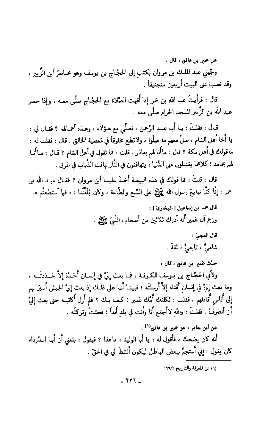 عن عمير بن هانئ، قال: وجّهني عبد الملك بن مروان بكتب إلى الحجّاج بن يوسف وهو محاصر ابن الزّبير، وقد نصب على البيت أربعين منجنيقاً. قال: فرأيت عبد الله بن عمر إذا أقيمت الصّلاة مع الحجّاج صلّى معه، وإذا حضر عبد الله بن الزّبير المسجد الحرام صلّى معه. قال: فقلت: يا أبا عبد الرّحمن، تصلّي مع هؤلاء، وهذه أعمالهم؟ فقال لي: يا أخا أهل الشّام، صلّ معهم ما صلّوا، ولا تطع مخلوقاً في معصية الخالق. قال: فقلت له: ما قولك في أهل مكة؟ قال: ما أنا لهم بعاذر. قلت: فما تقول في أهل الشّام؟ قال: ما أنا لهم بحامد؛ كلاهما يقتتلون على الدّنيا، يتهافتون في النّار تهافت الذّباب في المرق. قال: قلت: فما قولك في هذه البيعة أخذ علينا ابن مروان؟ فقال عبد الله بن عمر: إنّا كنّا نبايع رسول الله صَلَّى اللهُ عَلَيْهِ وَسَلَّمَ على السّمع والطّاعة، وكان يلقّننا: " فيما استطعتم ".