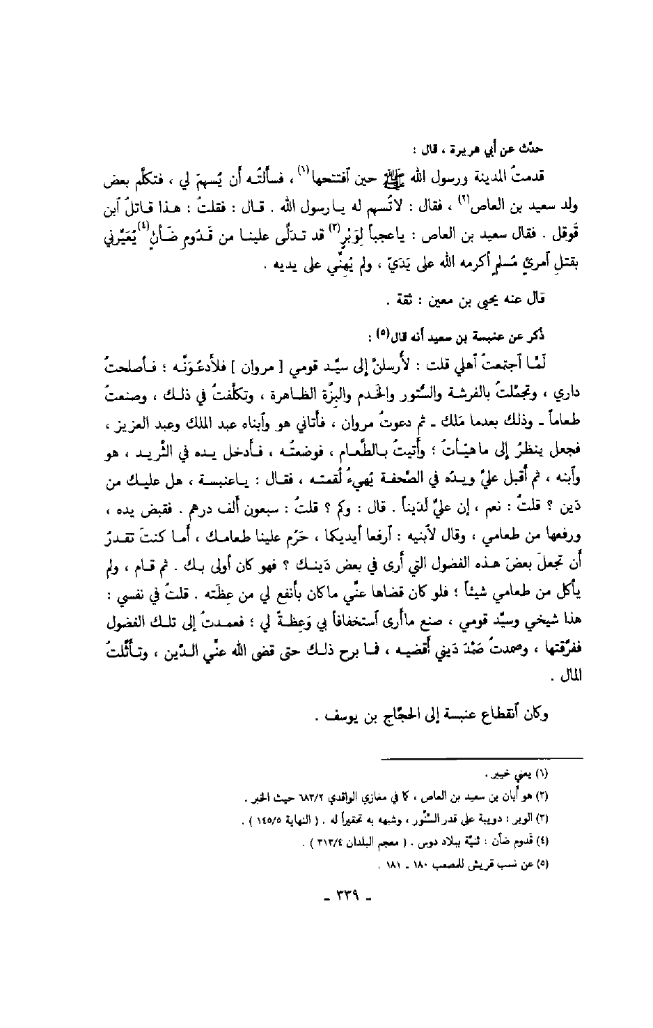 حدّث عن أبي هريرة، قال: قدمت المدينة ورسول الله صَلَّى اللهُ عَلَيْهِ وَسَلَّمَ حين افتتحها، فسألته أن يسهم لي، فتكلّم بعض ولد سعيد بن العاص، فقال: لاتسهم يا رسول الله. قال: هذا قاتل ابن قوقل. فقال سعيد بن العاص: يا عجباً لوبر قد تدلّى علينا من قدوم ضأن يعيّرني بقتل امرئ مسلم أكرمه الله على يديّ، ولم يهنّي على يديه. قال عنه يحيى بن معين: ثقة.