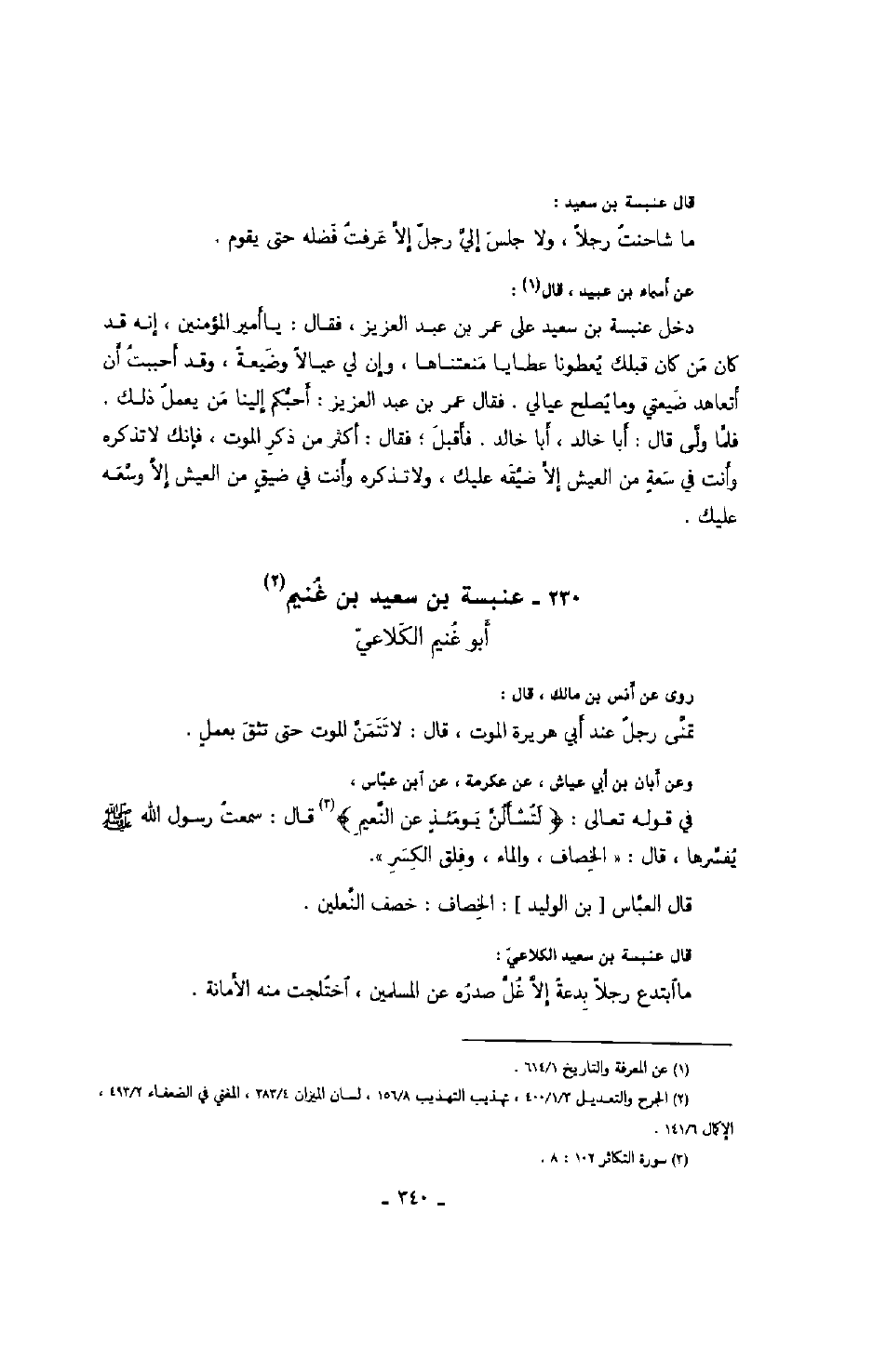 قال عنبسة بن سعيد: ما شاحنت رجلاً، ولا جلس إليّ رجل إلاّ عرفت فضله حتى يقوم.