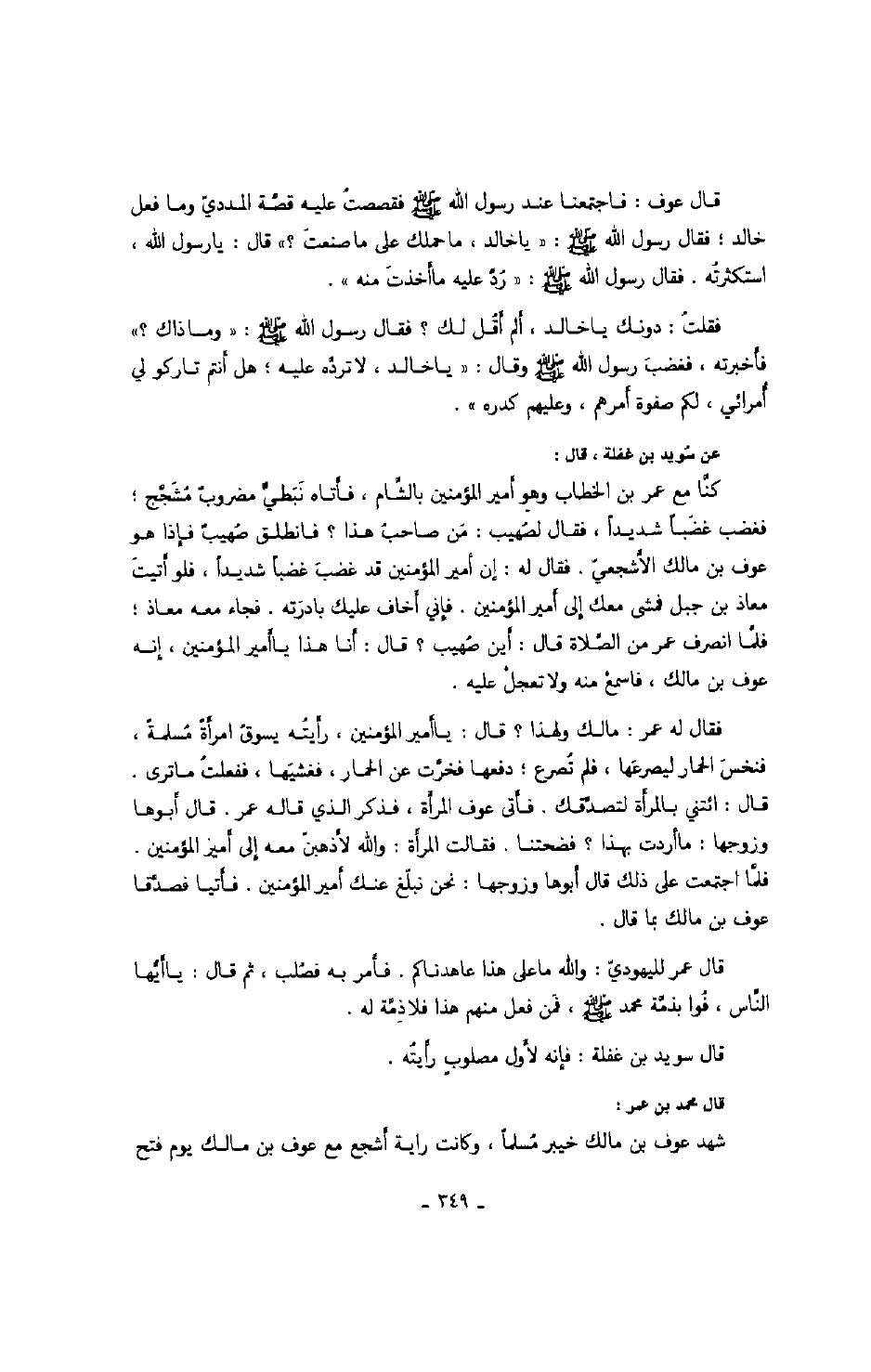 عن سويد بن غفلة، قال: كنّا مع عمر بن الخطاب وهو أمير المؤمنين بالشّام، فأتاه نبطيّ مضروب مشجّج؛ فغضب غضباً شديداً، فقال لصهيب: من صاحب هذا؟ فانطلق صهيب فإذا هو عوف بن مالك الأشجعيّ. فقال له: إن أمير المؤمنين قد غضب غضباً شديداً، فلو أتيت معاذ بن جبل فمشى معك إلى أمير المؤمنين. فإني أخاف عليك بادرته. فجاء معه معاذ؛ فلّما انصرف عمر من الصّلاة قال: أين صهيب؟ قال: أنا هذا يا أمير المؤمنين، إنه عوف بن مالك، فاسمع منه ولا تعجل عليه. فقال له عمر: مالك ولهذا؟ قال: يا أمير المؤمنين، رأيته يسوق امرأة مسلمة، فنخس الحمار ليصرعها، فلم تصرع؛ دفعها فخرّت عن الحمار، فغشيها، ففعلت ما ترى. قال: ائتني بالمرأة لتصدّقك. فأتى عوف المرأة، فذكر الذي قاله عمر. قال أبوها وزوجها: ما أردت بهذا؟ فضحتنا. فقالت المرأة: والله لأذهبنّ معه إلى أمير المؤمنين. فلّما اجتمعت على ذلك قال أبوها وزوجها: نحن نبلّغ عنك أمير المؤمنين. فأتيا فصدّقا عوف بن مالك بما قال. قال عمر لليهوديّ: والله ما على هذا عاهدناكم. فأمر به فصلب، ثم قال: يا أيّها النّاس، فوا بذمّة محمد صَلَّى اللهُ عَلَيْهِ وَسَلَّمَ، فمن فعل هذا فلا ذمّة له. قال سويد بن غفلة: فإنه لأول مصلوب رأيته.
