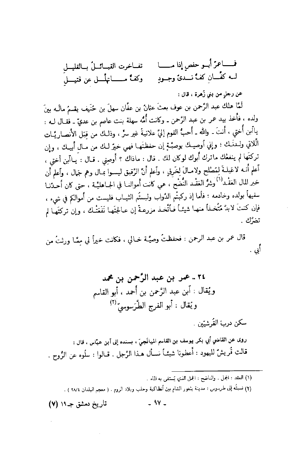 ويقال: ابن عبد الرّحمن بن أحمد، أبو القاسم ويقال: أبو الفرج الطّرسوسيّ سكن درب القرشيّين.