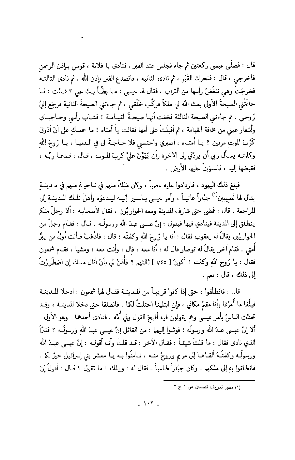 قال: فصلى عيسى ركعتين ثم جاء فجلس عند القبر، فنادى يا فلانة، قومي بإذن الرحمن فاخرجي، قال: فتحرك القبر، ثم نادى الثانية، فانصدع القبر بإذن الله، ثم نادى الثالثة فخرجت وهي تنفض رأسها من التراب، فقال لها عيسى: ما بطأ بك عني؟ قالت: لما جاءتني الصيحة الأولى بعث الله لي ملكاً فركب خلقي، ثم جاءتني الصيحة الثانية فرجع إلي روحي، ثم جاءتني الصيحة الثالثة فخفت أنها صيحة القيامة! فشاب رأسي وحاجباي وأشفار عيني من مخافة القيامة، ثم أقبلت على أمها فقالت يا أمتاه! ما حملك على أن أذوق كرب الموت مرتين؟ يا أمتاه، اصبري واحتسبي فلا حاجة لي في الدنيا، يا روح الله وكلمته يسأل ربي أن يردني إلى الآخرة وأن يهون علي كرب الموت، قال: فدعا ربه، فقبضها إليه، فاستوت عليها الأرض.