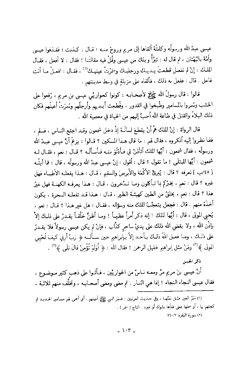 عيسى عبد الله ورسوله وكلمته ألقاها إلى مريم وروحٌ منه، فآمنوا به يا معشر بني إسرائيل خيرٌ لكم. فانطلقوا به إلى ملكهم - وكان جباراً طاغياً - فقال له: ويلك! ما تقول؟ قال: أقول إن عيسى عبد اللهورسوله وكلمته ألقاها إلى مريم وروحٌ منه؛ قال: كذبت؛ فقذفوا عيسى وأمه بالبهتان، ثم قال له: تبرأ ويلك من عيسى وقل فيه مقالتنا! فقال: لا أفعل، فقال الملك: إن لم تفعل قطعت يديك ورجليك وسمرت عينيك، فقال: افعل ما أنت فاعل. قال: ففعل به ذلك، فألقاه على مزبلةٍ في وسط مدينتهم.