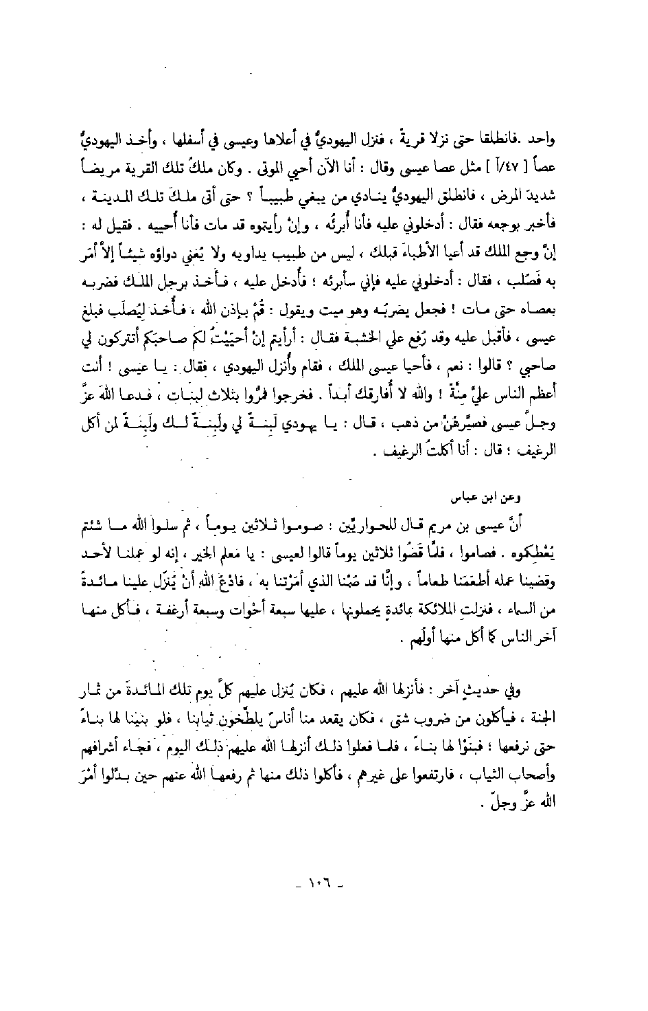 واحد؛ فانطلقا حتى نزلا قريةً، فنزل اليهودي في أعلاها وعيسى في أسفلها، وأخذ اليهودي عصاً مثل عصا عيسى وقال: أنا الآن أحيي الموتى. وكان ملك تلك القرية مريضاً شديد المرض. فانطلق اليهودي ينادي من يبغي طبيباً؟ حتى أتى ملك تلك المدين، فأخبر بوجعه فقال: أدخلوني عليه فأنا أبرئه، وإن رأيتموه قد مات فأنا أحييه. فقيل له: إن وجع الملك قد أعيا الأطباء قبلك، ليس من طبيب يداويه ولا يغني دواؤه شيئاً إلا أمر به فصلب، فقال: أدخلوني عليه فإني سأبرئه؛ فأدخل عليه، برجل الملك فضربه بعصاه حتى مات! فجعل يضربه وهو ميت ويقول: قم بإذن الله، فأذخ ليصلب فبلغ عيسى، فأقبل عليه وقد رفع علي الخشبة فقال: أرأيتم إن أحييت لكم صاحبكم أتتركون لي صاحبي؟ قالوا: نعم، فأحيا عيسى الملك، فقام وأنزل اليهودي، فقال: يا عيسى! أنت أعظم الناس علي منةً! والله لا أفارقك أبداً. فخرجوا فمروا بثلاث لبنات، فدعا الله عز وجل عيسى فصيرهن من ذهب، قال: يا يهودي لبنةٌ لي ولبنةٌ لك ولبنةٌ لمن أكل الرغيف؛ قال: أنا أكلت الرغيف.