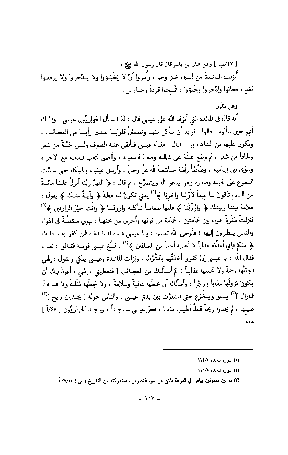 وعن عمار بن ياسر قال: قال رسول الله صَلَّى اللهُ عَلَيْهِ وَسَلَّمَ: أنزلت المائدة من السماء خبز ولحم، وأمروا أن لا يخبؤوا ولا يدخروا ولا يرفعوا لغدٍ، فخانوا وادخروا وخبؤوا، فمسخوا قردةً وخنازير.