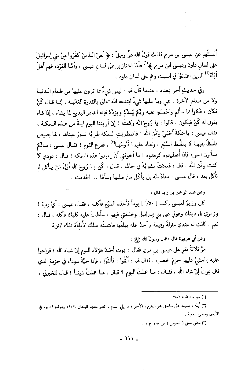 وفي حديثٍ آخر بمعناه: عندما قال لهم: ليس شيء مما ترون عليها من طعام الدنيا ولا من طعام الآخرة، هي وما عليها شيء ابتدعه الله تعالى بالقدرة الغالبة، إنما قال كن فكان، فكلوا مما سألتم واحمدوا عليه ربكم يمدكم ويردكم فإنه القادر البديع لما يشاء، إذا شاء يقول له كن فيكون. قالوا: يا روح الله وكلمته! إن أريتنا اليوم آية من هذه السمكة، فقال عيسى: يا سمكة أحيي بإذن الله! فاضطربت السمكة طرية تدور عيناها، لها بصيص تلمظ بفيها كما يتلمظ السبع، وعاد عليها فلوسها، ففزع القوم! فقال عيسى: ما لكم تسألون الشيء فإذا أعطيتموه كرهتموه! ما أخوفني أن يعبدوا هذه السمكة! قال: عودي كما كنت بإذن الله. قال: فعادت مشويةً في حالها. قال: كن يا روح الله أول من يأكل ثم نأكل بعد، قال عيسى: معاذ الله بل يأكل من طلبها وسألها ... الحديث.