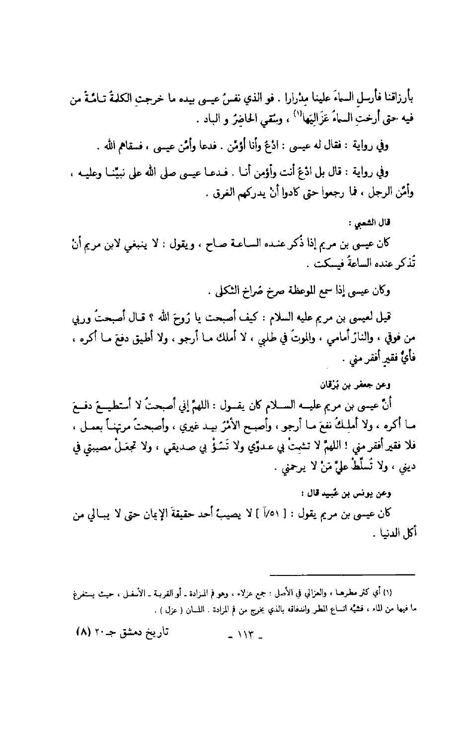 وعن جعفر بن برقان أن عيسى بن مريم عليه السلام كان يقول: اللهم إني أصبحت لا أستطيع دفع ما أكره، ولا أملك نفع ما أرجو، وأصبح الأمر بيد غيري، وأصبحت مرتهناً بعمل، فلا فقير أفقر مني! اللهم لا تشمت بي عدوي ولا تسؤ بي صديقي، ولا تجعل مصيبتي في ديني، ولا تسلط علي من لا يرحمني.