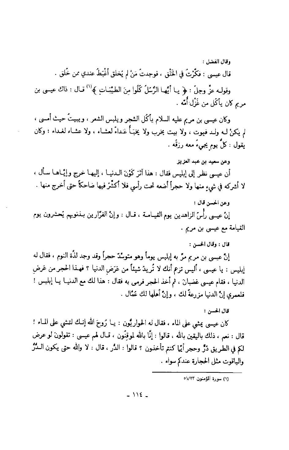 وعن سعيد بن عبد العزيز أن عيسى نظر إلى إبليس فقال: هذا آثر كون الدنيا، إليها خرج وإياها سأل، لا أشركه في شيءٍ منها ولا حجراً أضعه تحت رأسي فلا أكشر فيها ضاحكاً حتى أخرج منها.