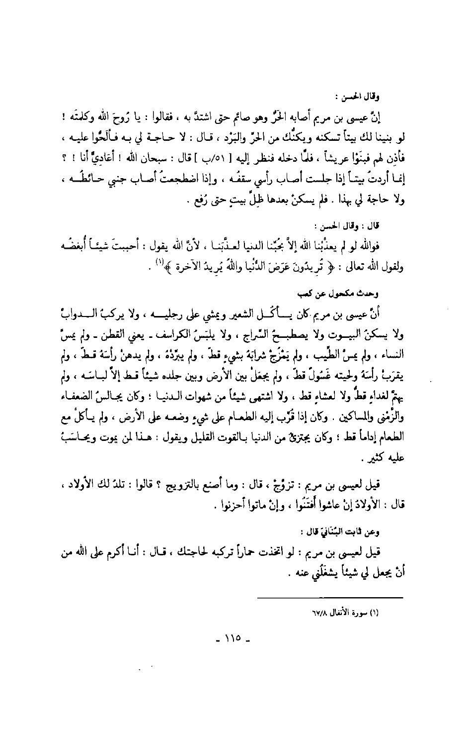 وقال الحسن: إن عيسى بن مريم أصابه الحر وهو صائم حتى اشتد به، فقالوا: يا روح الله وكلمته! لو بنينا لك بيتاً تسكنه ويكنك من الحر والبرد، قال: لا حاجة لي به فألحوا عليه، فأذن لهم فبنوا عريشاً، فلما دخله فنظر إليه قال: سبحان الله! أعادي أنا!؟ إنما أردت بيتاً إذا جلست أصاب رأسي سقفه، وإذا اضطجعت أصاب جنبي حائطه، ولا حاجة لي بهذا. فلم يسكن بعدها ظل بيتٍ حتى رفع.