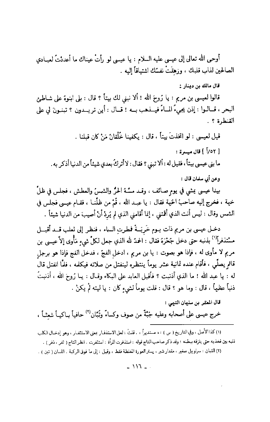 دخل عيسى بن مريم ذات يوم خربةً فمطرت السماء، فنظر إلى ثعلب قد أقبل مستذفراً بذنبه حتى دخل جحره فقال: الحمد لله الذي جعل لكل شيءٍ مأوى إلا عيسى بن مريم لا مأوى له، فإذا هو بصوت: يا بن مريم، ادخل الفج، فدخل الفج فإذا هو برجلٍ قائمٍ يصلي، فأقام عنده ثمانية عشر يوماً ينتظره لينفتل من صلاته فيكلمه، فلما انفتل قال له: يا عبد الله! ما الذي أذنبت؟ فأقبل العابد على البكاء وقال: يا روح الله، أذنبت ذنباً عظيماً، قال: وما هو؟ قال: قلت يوماً لشيءٍ كان: يا ليته لم يكن.