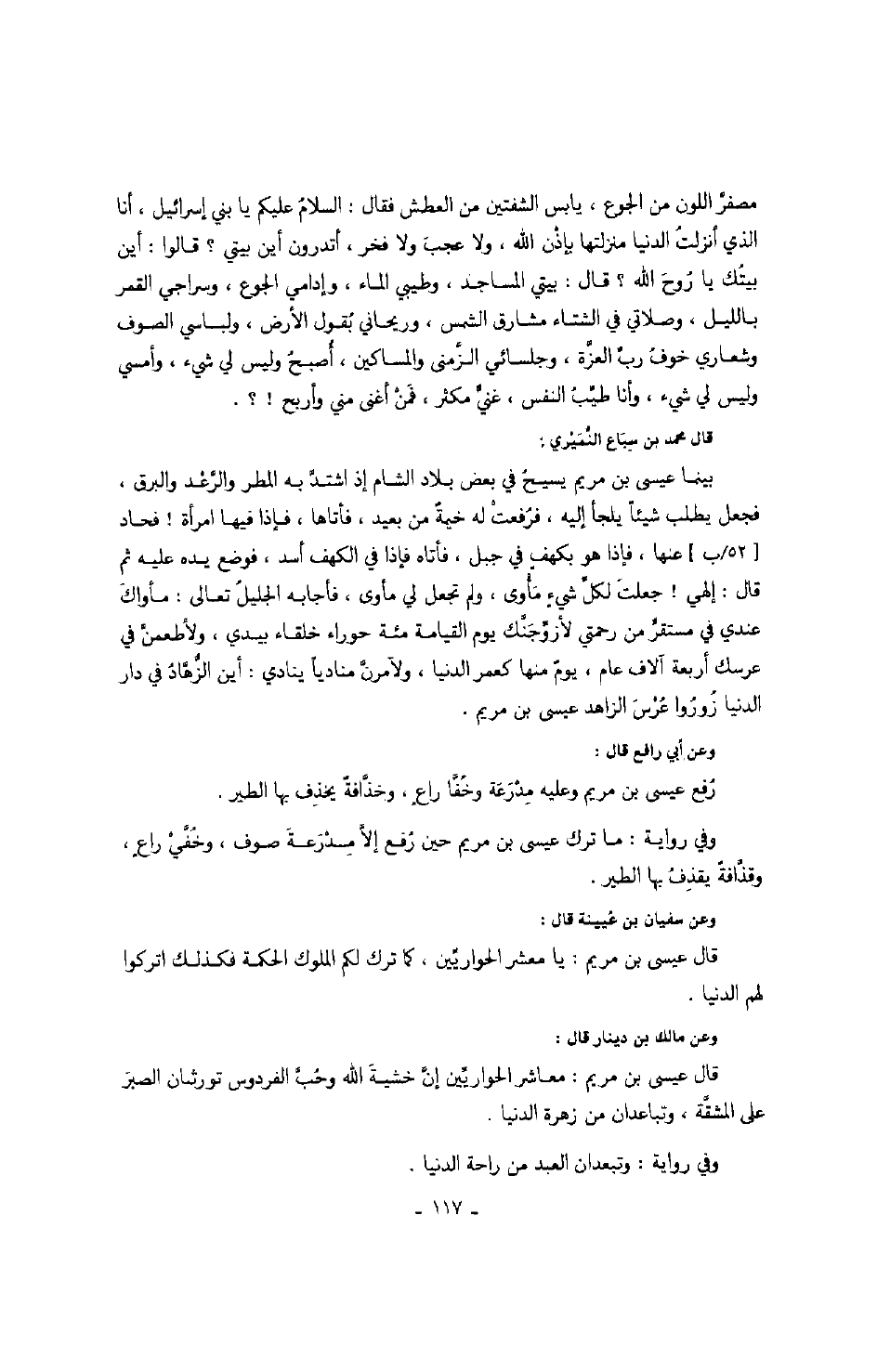 وعن مالك بن دينار قال: قال عيسى بن مريم: معاشر الحواريين إن خشية الله وحب الفردوس تورثان الصبر على المشقة، وتباعدان من زهرة الدنيا، وفي رواية: وتبعدان العبد من راحة الدنيا.