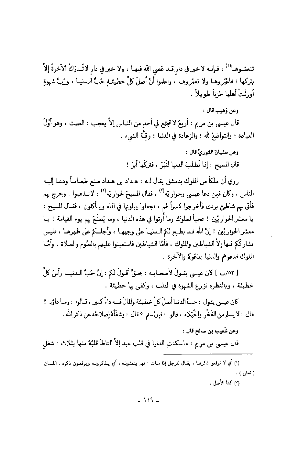 كان عيسى يقول لأصحابه: بحق أقول لكم: إن حب الدنيا رأس كل خطيئة، وبالنظرة تزرع الشهوة في القلب، وكفى بها خطيئة.