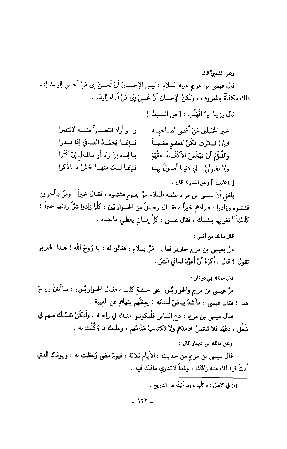 وعن الشعبي قال: قال عيسى بن مريم عليه السلام: ليس الإحسان أن تحسن إلى من أحسن إليك إنما ذاك مكافأةٌ بالمعروف، ولكن الإحسان أن تحسن إلى من أساء إليك.