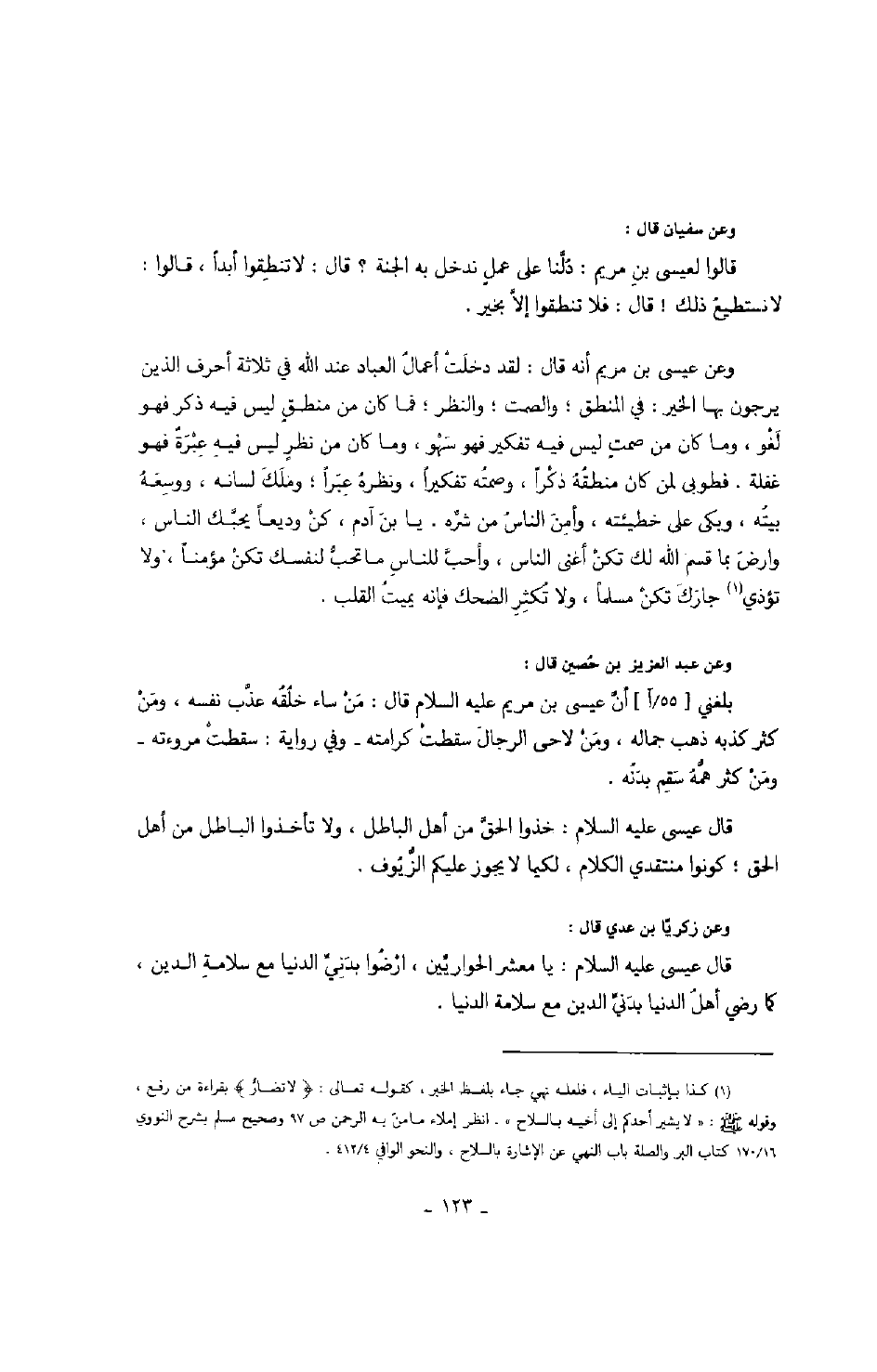 وعن سفيان قال: قالوا لعيسى بن مريم: دلنا على عملٍ ندخل به الجنة؟ قال: لا تنطقوا أبداً، قالوا: لا نستطيع ذلك! قال: فلا تنطقوا إلا بخير.