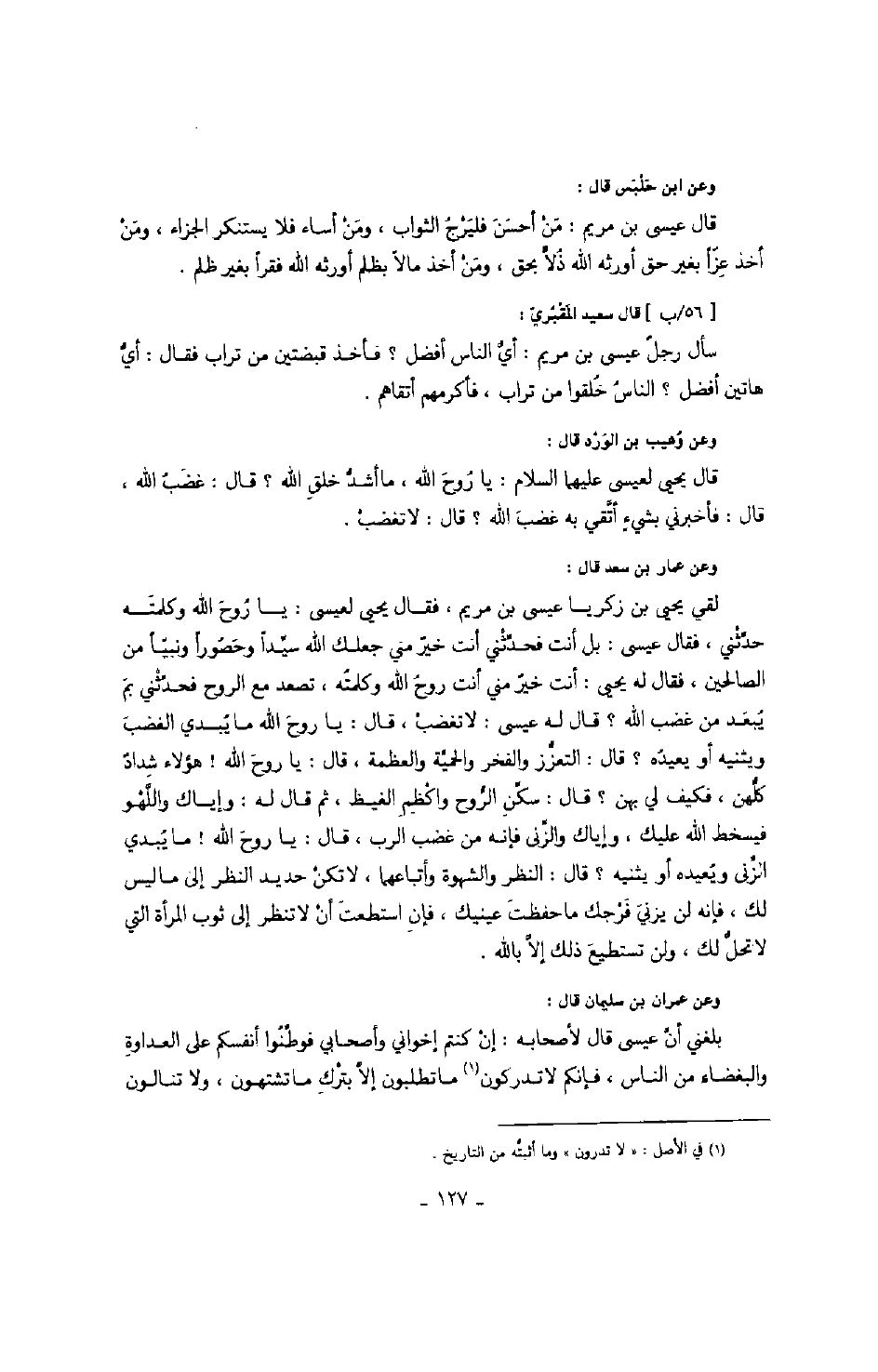 وعن عمران بن سليمان قال: بلغني أن عيسى قال لأصحابه: إن كنتم إخواني وأصحابي فوطنوا أنفسكم على العداوة والبغضاء من الناس، فإنكم لا تدركون ما تطلبون إلا بترك ما تشتهون، ولا تنالون