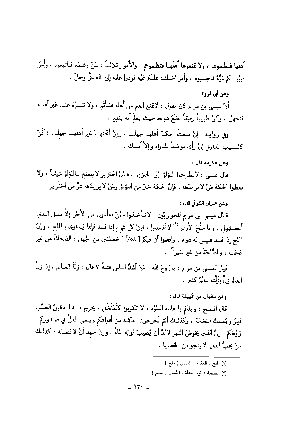 وعن أبي فروة أن عيسى بن مريم كان يقول: لا تمنع العلم من أهله فتأثم، ولا تنشره عن غير أهله فتجهل، وكن طبيباً رفيقاً يضع دواءه حيث يعلم أنه ينفع.