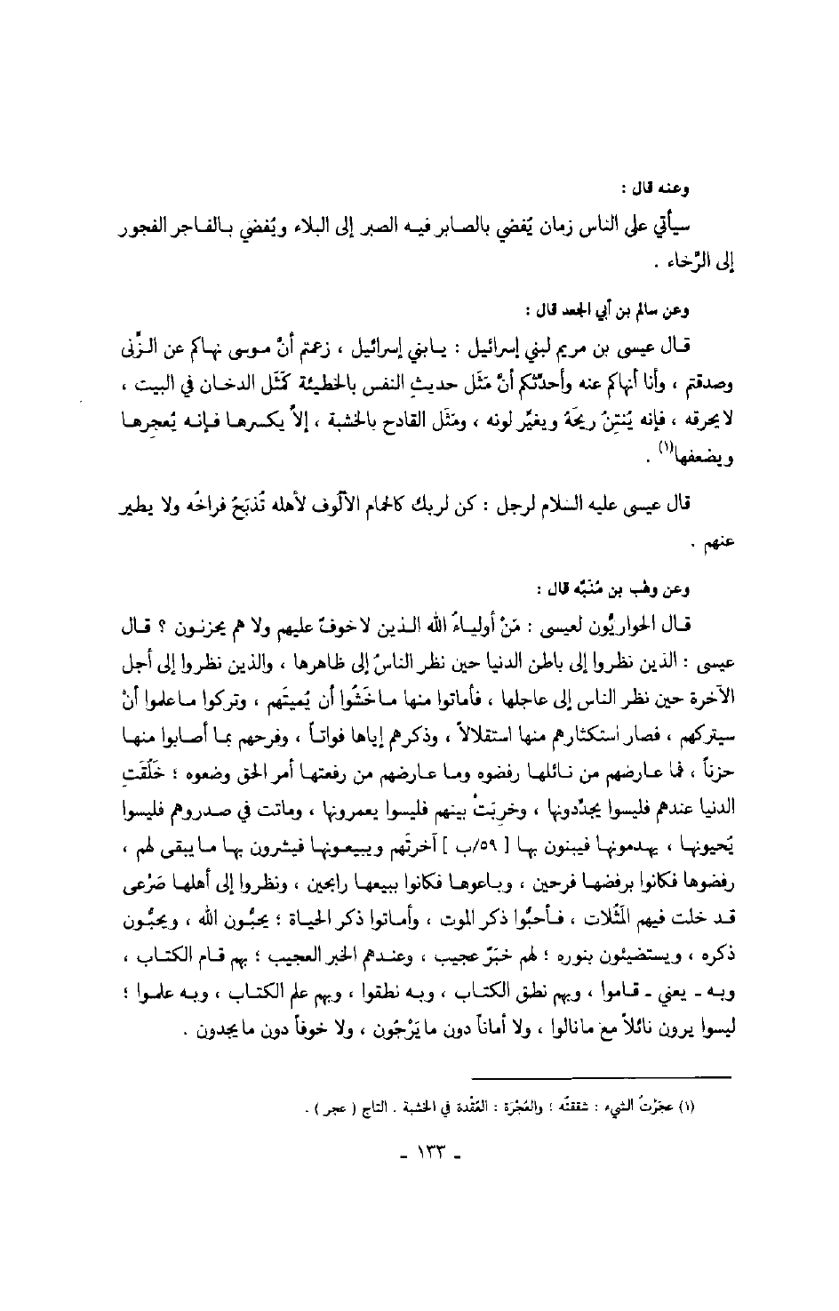 وعن وهب بن منبه قال: قال الحواريون لعيسى: من أولياء الله الذين لا خوفٌ عليهم ولا هم يحزنون؟ قال عيسى: الذين نظروا إلى باطن الدنيا حين نظر الناس إلى ظاهرها، والذين نظروا إلى أجل الآخرة حين نظر الناس إلى عاجلها، فأماتوا منها ما خشوا أن يميتهم، وتركوا ما علموا أن سيتركهم، فصار استكثارهم منها استقلالاً، وذكرهم إياها فواتاً، وفرحهم بما أصابوا منها حزناً، فما عارضهم من نائلها رفضوه وما عارضهم من رفعتها أمر الحق وضعوه؛ خلقت الدنيا عندهم فليسوا يجددونها، وخربت بينهم فليسوا يعمرونها، وماتت في صدورهم فليسوا يحيونها، يهدمونها فيبنون بها آخرتهم ويبيعونها فيشترون بها ما يبقى لهم، رفضوها فكانوا برفضها فرحين، وباعوها فكانوا ببيعها رابحين، ونظروا إلى أهلها ضرعى قد خلت فيهم المثلات، فأحبوا ذكر الموت، وأماتوا ذكر الحياة؛ يحبون الله، ويحبون ذكره، ويستضيئون بنوره؛ لهم خيرٌ عجيب، وعندهم الخبر العجيب؛ بهم قام الكتاب، وبه - يعني - قاموا، وبهم نطق الكتاب، وبه نطقوا، وبهم علم الكتاب، وبه علموا؛ ليسوا يرون نائلاً مع ما نالوا، ولا أمماناً دون ما يرجون، ولا خوفاً دون ما يجدون.