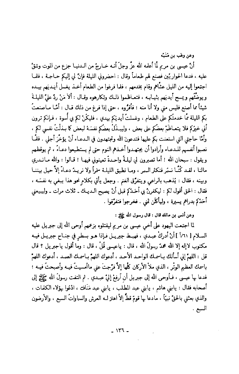 وعن أنس بن مالك قال: قال رسول الله صَلَّى اللهُ عَلَيْهِ وَسَلَّمَ: لما اجتمعت اليهود على أخي عيسى بن مريم ليقتلوه بزعمهم أوحى الله إلى جبريل عليه السلام أن أدرك عبدي، فهبط جبريل فإذا هو بسطرٍ في جناح جبريل فيه مكتوب لا إله إلا الله محمدٌ رسول الله، قال: يا عيسى قل، قال: وما أقول يا جبريل؟ قال قل: اللهم إني أسألك باسمك الواحد الأحد، أدعوك اللهم باسمك الصمد، أدعوك اللهم باسمك العظيم الوتر، الذي ملأ الأركان كلها إلا فرجت عني ما أمسيت فيه وأصبحت فيه؛ فدعا بها عيسى، فأوحى الله إلى جبريل أن ارفع إلي عبدي. ثم التفت رسول الله صَلَّى اللهُ عَلَيْهِ وَسَلَّمَ إلى أصحابه فقال: يا بني هاشم، يا بني عبد المطلب، يا بني عبد مناف، ادعوا بهؤلاء الكلمات، والذي بعثني بالحق نبياً، ما دعا قومٌ قط إلا اهتز له العرش والسماوات السبع، والأرضون السبع.