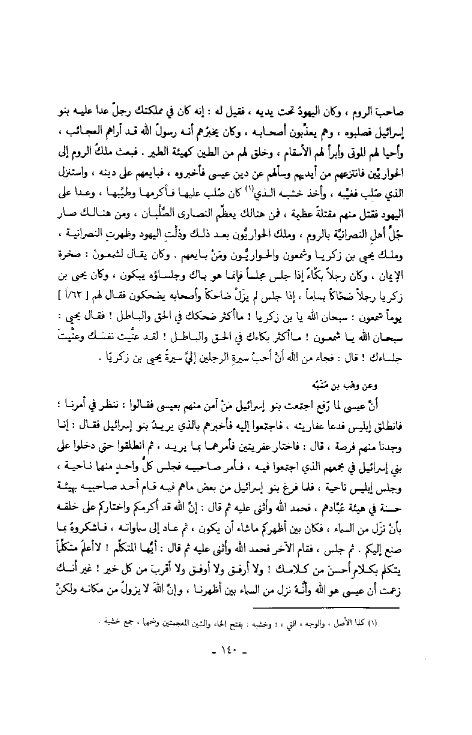 صاحب الروم، وكان اليهود تحت يديه، فقيل له: إنه كان في مملكتك رجلٌ عدا عليه بنو إسرائيل فصلبوه، وهم يعذبون أصحابه، وكان يخبرهم أنه رسول الله قد أراهم العجائب، وأحيا لهم الموتى وأبرأ لهم الأسقام، وخلق لهم من الطين كهيئة الطير. فبعث ملك الروم إلى الحواريين فانتزعهم من أيديهم وسألهم عن دين عيسى فأخبروه، فبايعهم على دينه، واستنزل الذي صلب فغيبه، وأخذ خشبه الذي كان صلب عليها فأكرمها وطيبها، وعدا على اليهود فقتل منهم مقتلةٌ عظيمة، فمن هنالك يعظم النصارى الصلبان، ومن هنالك صار جل أهل النصرانية بالروم، وملك الحواريون بعد ذلك وذلت اليهود وظهرت النصرانية، وملك يحيى بن زكريا وشمعون والحواريون ومن بايعهم. وكان يقال لشمعون: صخرة الإيمان، وكان رجلاً بكاءً إذا جلس مجلساً فإنما هو باك وجلساؤه يبكون، وكان يحيى بن زكريا رجلاً صحاكاً بساماً، إذا جلس لم يزل ضاحكاً وأصحابه يضحكون فقال لهم يوماً شمعون: سبحان الله يا بن زكريا؟ ما أكثر ضحكك في الحق والباطل! فقال يحيى: سبحان الله يا شمعون! ما أكثر بكاءك في الحق والباطل! لقد عنيت نفسك وعنيت جلساءك! قال: فجاء من الله أن أحب سيرة الرجلين إلى سيرة يحيى بن زكريا.