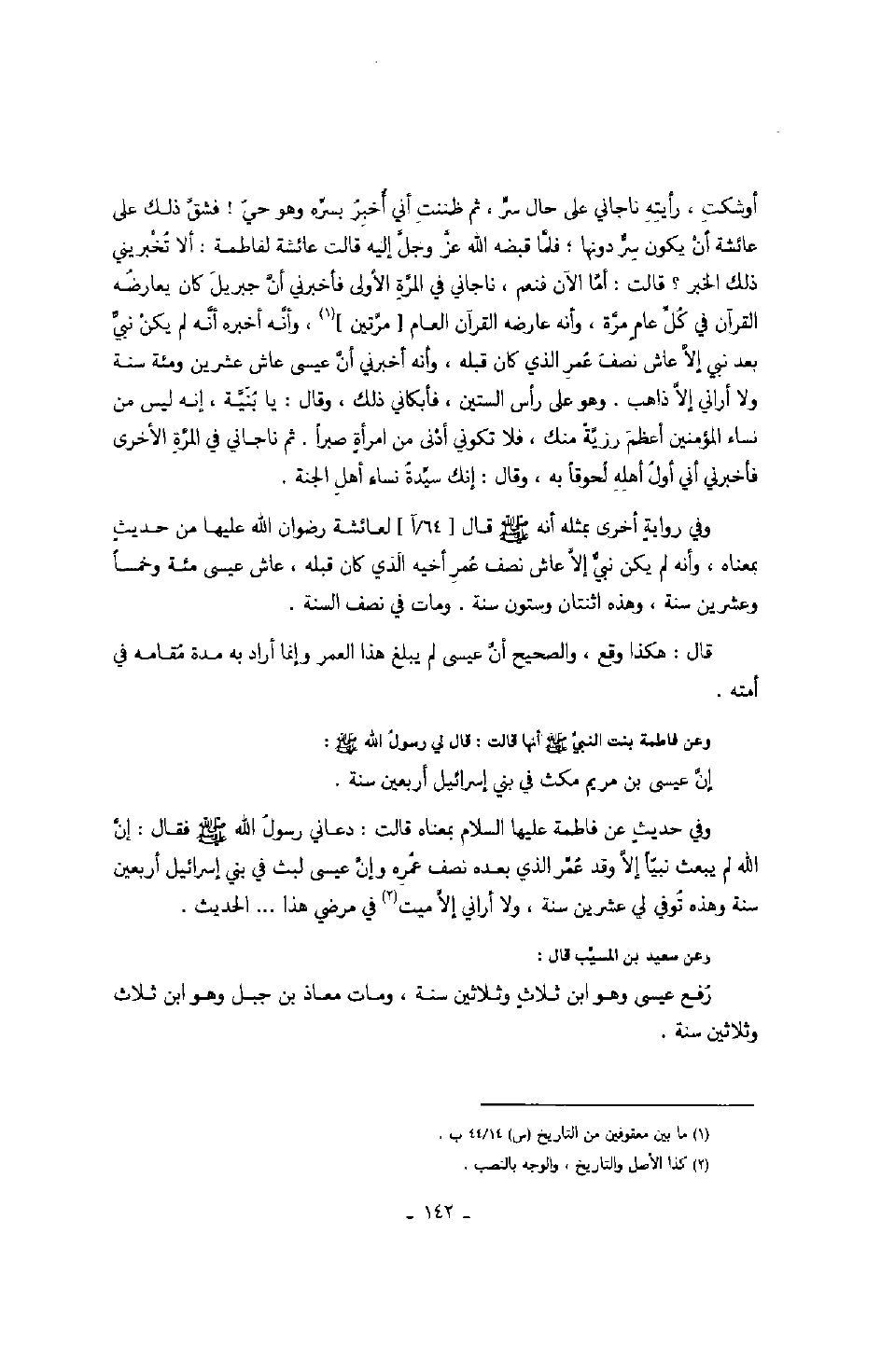 أوشكت، رأيته ناجاني على حال سر، ثم ظننت أني أخبر بسره وهو حي! فشق ذلك على عائشة أن يكون سر دونها؛ فلما قبضه الله عز وجل إليه قالت عائشة لفاطمة: ألا تخبريني ذلك الخبر؟ قالت: أما الآن فنعم، ناجاني في المرة الأولى فأخبرني أن جبريل كان يعارضه القرآن في كل عامٍ مرة، وأنه عارضه القرآن العام مرتين، وأنه أخبره أنه لم يكن نبي بعد نبي إلا عاش نصف عمر الذي كان قبله، وأنه أخبرني أن عيسى عاش عشرين ومئة سنة ولا أراني إلا ذاهب. وهو على رأس الستين، فأبكاني ذلك، وقال: يا بنية، إنه ليس من نساء المؤمنين أعظم رزية منك، فلا تكوني أدنى من امرأةٍ صبراً. ثم ناجاني في المرة الأخرى فأخبرني أني أول أهله لحوقاً به، وقال: إنك سيدة نساء أهل الجنة.