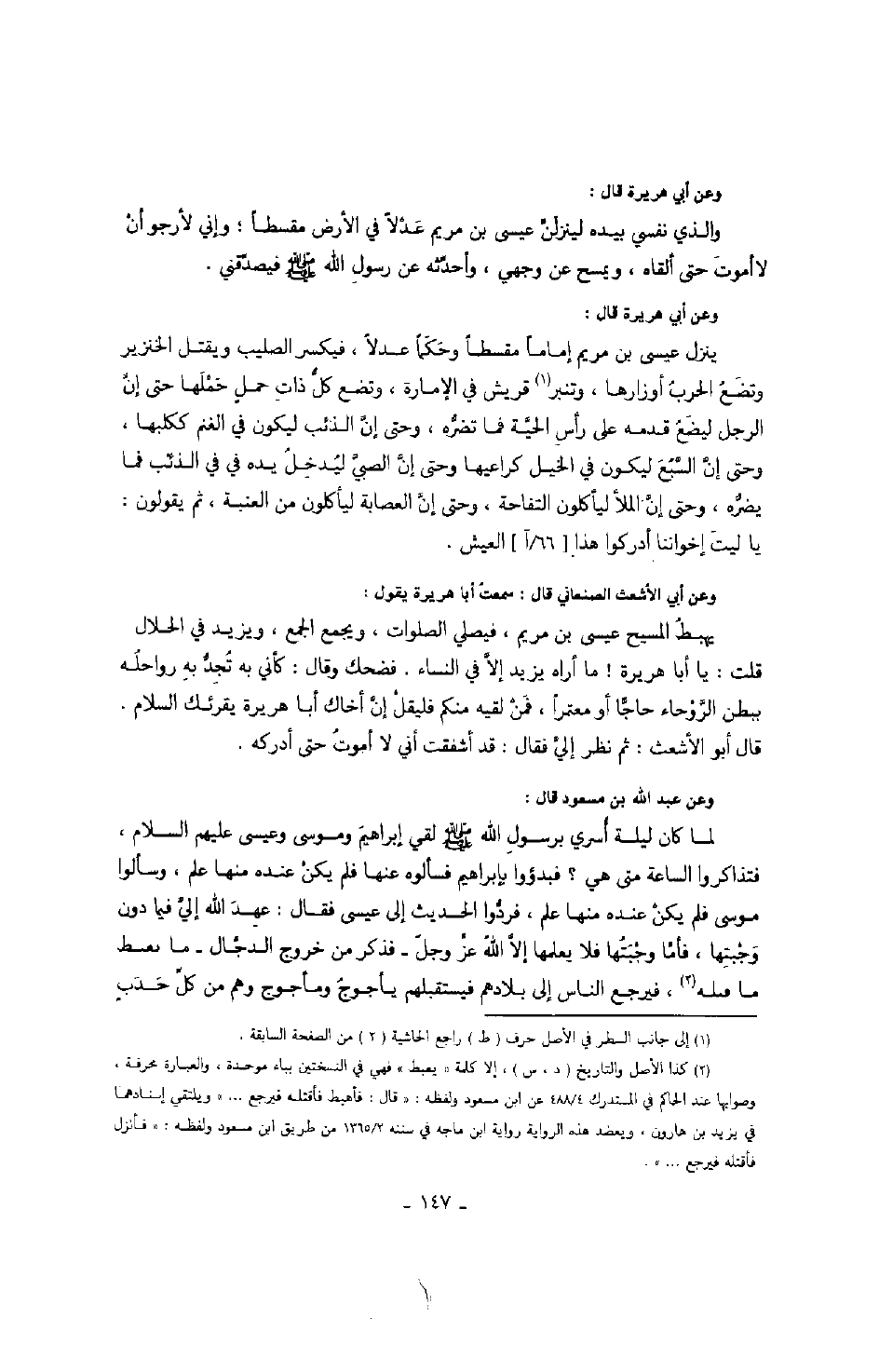 وعن أبي الأشعث الصنعاني قال: سمعت أبا هريرة يقول: يهبط المسيح عيسى بن مريم، فيصلي الصوات، ويجمع الجمع، ويزيد في الحلال قلت: يا أبا هريرة! ما أراه يزيد إلا في النساء. فضحك وقال: كأني به تجد به رواحله ببطن الروحاء حاجاً أو معتمراً، فمن لقيه منكم فليقل إن أخاك أبا هريرة يقرئك السلام. قال أبو الأشعث: ثم نظر إلي فقال: قد أشفقت أني لا أموت حتى أدركه.