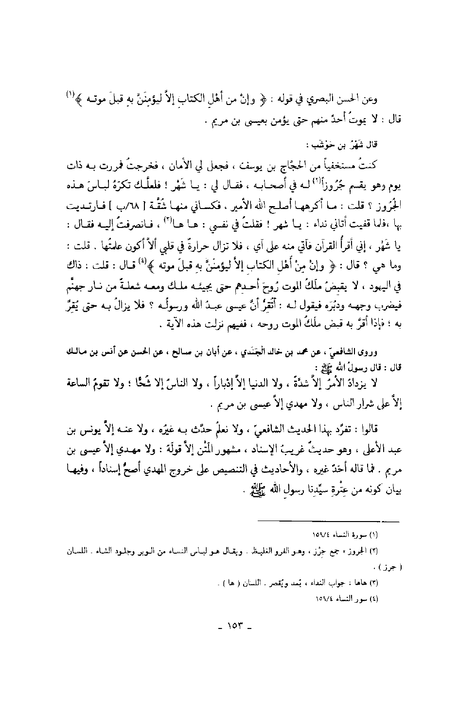 قال شهر بن حوشب: كنت مستخفياً من الحجاج بن يوسف، فجعل لي الأمان، فخرجت فمررت به ذات يوم وهو يقسم جروزاً له في أصحابه، فقال لي: يا شهر! فلعلك تكره لباس هذه الجروز؟ قلت: ما أهكرهها أصلح الله الأمير، فكساني منها شقة فارتديت بها، فلما قفيت أتاني نداء: يا شهر! فقلت في نفسي: ها ها، فانصرفت إليه فقال: يا شهر، إني أقرأ القرآن فآتي منه على آي، فلا تزال حرارةٌ في قلبي ألا أكون علمتها، قلت: وما هي؟ قال: " وإن من أهل الكتاب إلا ليؤمنن به قبل موته " قال: قلت: ذاك في اليهود، لا يقبض ملك الموت روح أحدهم حتى يجيئه ملك ومعه شعلةٌ من نار جهنم فيضرب وجهه ودبره فيقول له: أتقر أن عيسى عبد الله ورسوله؟ فلا يزال به حتى يقر به؛ فإذا أقر به قبض ملك الموت روحه، ففيهم نزلت هذه الآية.