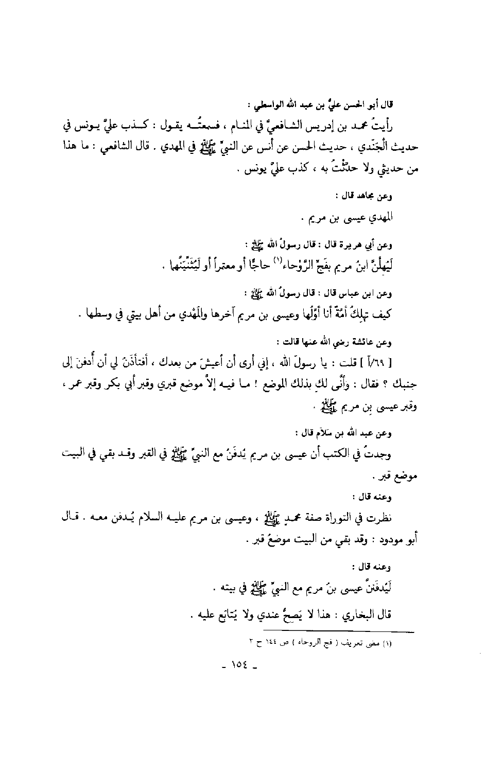 وعن أبي هريرة قال: قال رسول الله صَلَّى اللهُ عَلَيْهِ وَسَلَّمَ: ليهلن ابن مريم بفج الروحاء حاجا أو معتمراً أو ليثنينهما.