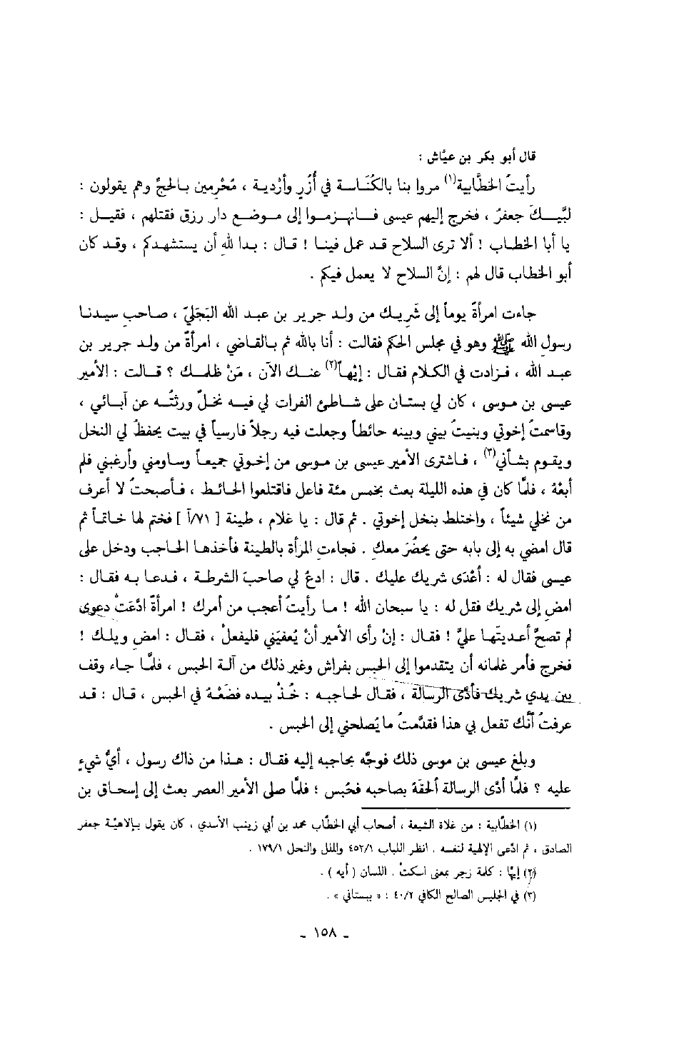 رأيت الخطابية مروا بنا بالكناسة في أزر وأردية، محرمين بالحج وهم يقولون: لبيك جعفر، فخرج إليهم عيسى فانهزموا إلى موضع دار رزق فقتلهم، فقيل: يا أبا الخطاب! ألا ترى السلاح قد عمل فينا! قال: بدا لله أن يستشهدكم، وقد كان أبو الخطاب قال لهم: إن السلاح لا يعمل فيكم.