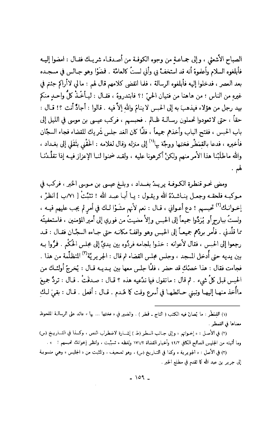 ومضى نحو قنطرة الكوفة يريد بغداد، وبلغ عيسى بن موسى الخبر، فركب في موكبه فلحقه وجعل يناشده الله ويقول: يا أبا عبد الله! تثبت انظر، إخوانك تحبسهم! دع أعواني، قال: نعم لأنهم مشوا لك في أمرٍ لم يجب عليهم فيه، ولست ببارحٍ أو يردوا جميعاً إلى الحبس وإلا مضيت من فوري إلى أمير المؤمنين، فاستعفيته مما قلدني. فأمر بردهم جميعاً إلى الحبس وهو واقفٌ مكانه حتى جاءه السجان فقال: قد رجعوا إلى الحبس، فقال لأعوانه: خذوا بلجامه فردوه بين يدي إلى مجلس الحكم. فمروا به بين يديه حتى أدخل المسجد، وجلس مجلس القضاء ثم قال: الجريرية المتظلمة من هذا. فجاءت فقال: هذا خصمك قد حضر، فلما جلس معها بين يديه قال: يخرج أولئك من الحبس قبل كل شيء. ثم قال: ما تقول فيما تدعيه هذه؟ قال: صدقت. قال: ترد جميع ما أخذ منها إليها وتبني حائطها في أسرع وقت كما هدم. قال: أفعل. قال: بقي لك
