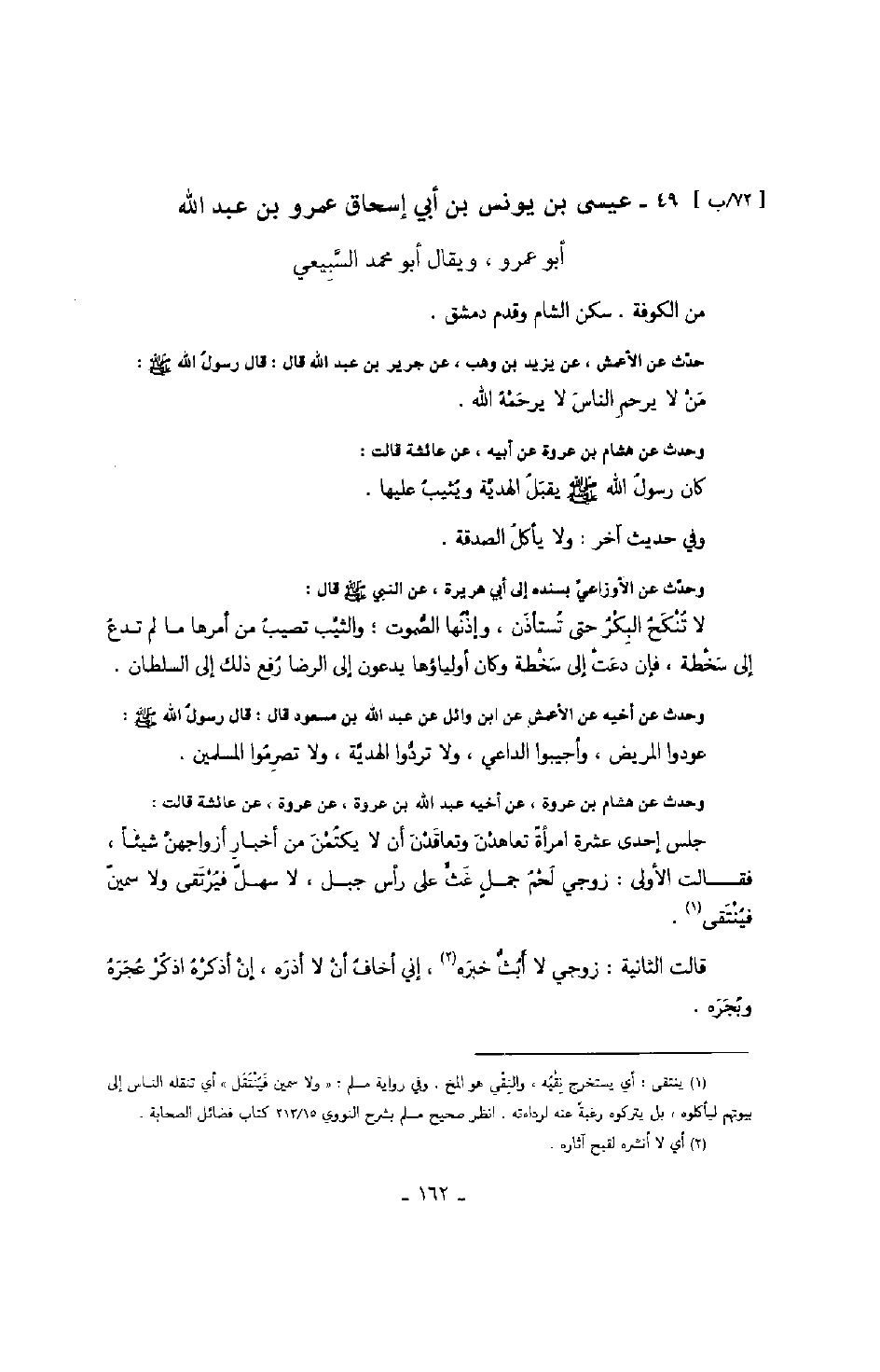 وحدث عن هشام بن عروة، عن أخيه عبد الله بن عروة، عن عروة، عن عائشة قالت: جلس إحدى عشرة امرأة تعاهدن وتعاقدن أن لا يكتمن من أخبار أزواجهن شيئاً. فقالت الأولى: زوجي لحم جملٍ غث على رأس جبل، لا سهل فيرتقى ولا سمين فينتقى.
