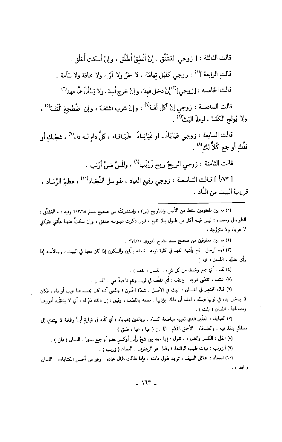 قالت التاسعة: زوجي رفيع العماد، طويل النجاد، عظيم الرماد، قريب البيت من الناد.