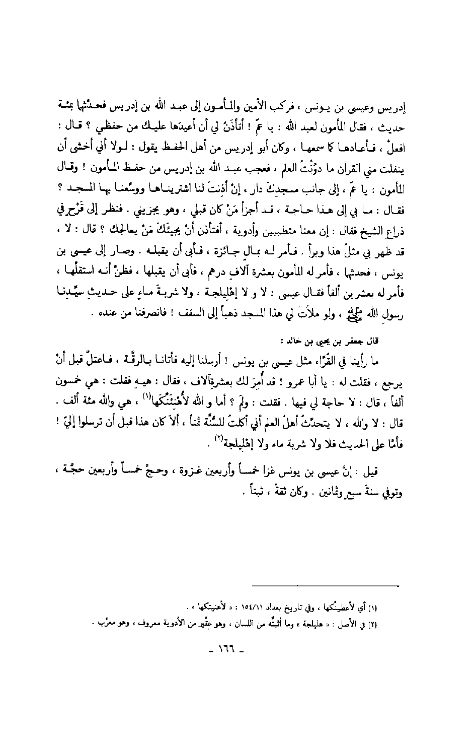 إدريس وعيسى بن يونس، فركب الأمين والمأمون إلى عبد الله بن إدريس فحدثهما بمئة حديث، فقال المأمون لعبد الله: يا عم! أتأذن لي أن أعيدها عليك من حفظي؟ قال: افعل، فأعادها كما سمعها، وكان أبو إدريس من أهل الحفظ يقول: لولا أني أخشى أن ينفلت مني القرآن ما دونت العلم، فعجب عبد الله بن إدريس من حفظ المأمون! وقال المأمون: يا عم، إلى جانب مسجدك دار، إن أذنت لنا اشترناها ووسعنا بها المسجد؟ فقال: ما بي إلى هذا حاجة، قد أجزأ من كان قبلي، وهو يجزيني. فنظر إلى قرحٍ في ذراع الشيخ فقال: إن معنا متطببين وأدوية، أفتأذن أن يجيئك من يعالجك؟ قال: لا، قد ظهر بي مثل هذا وبرأ. فأمر له بمالٍ جائزة، فأبى أن يقبله. وصار إلى عيسى بن يونس، فحدثهما، فأمر له المأمون بعشرة آلاف درهم، فأبى أن يقبلها، فظن أنه استقلها، فأمر له بعشرين ألفاً فقال عيسى: لا ولا إهليلجة، ولا شربة ماءٍ على حديث سيدنا رسول الله صَلَّى اللهُ عَلَيْهِ وَسَلَّمَ، ولو ملأت لي هذا المسجد ذهباً إلى السقف! فانصرفنا من عنده.