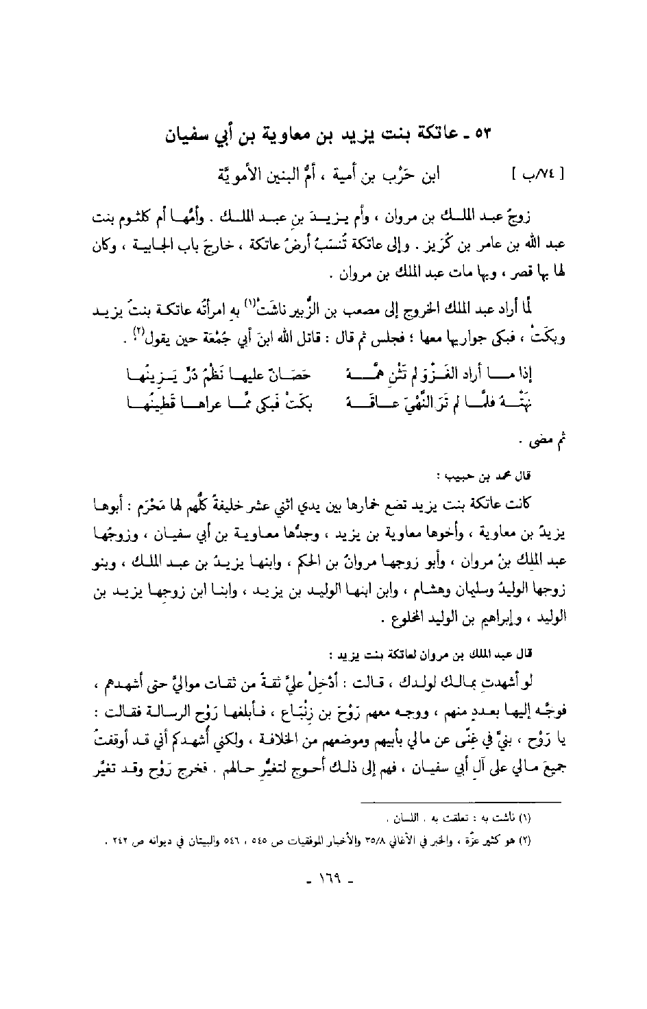 قال محمد بن حبيب: كانت عاتكة بنت يزيد تضع خمارها بين يدي اثني عشر خليفةً كلهم لها محرم: أبوها يزيد بن معاوية، وأخوها معاوية بن يويد، وجدها معاوية بن أبي سفيان، وزوجها عبد الملك بن مروان، وأبو زوجها مروان بن الحكم، وابنها يزيد بن عبد الملك، وبنو زوجها الوليد وسليمان وهشام، وابن ابنها الويد بن يزيد، وابنا ابن زوجها يزيد بن الوليد، وابراهيم بن الوليد المخلوع.