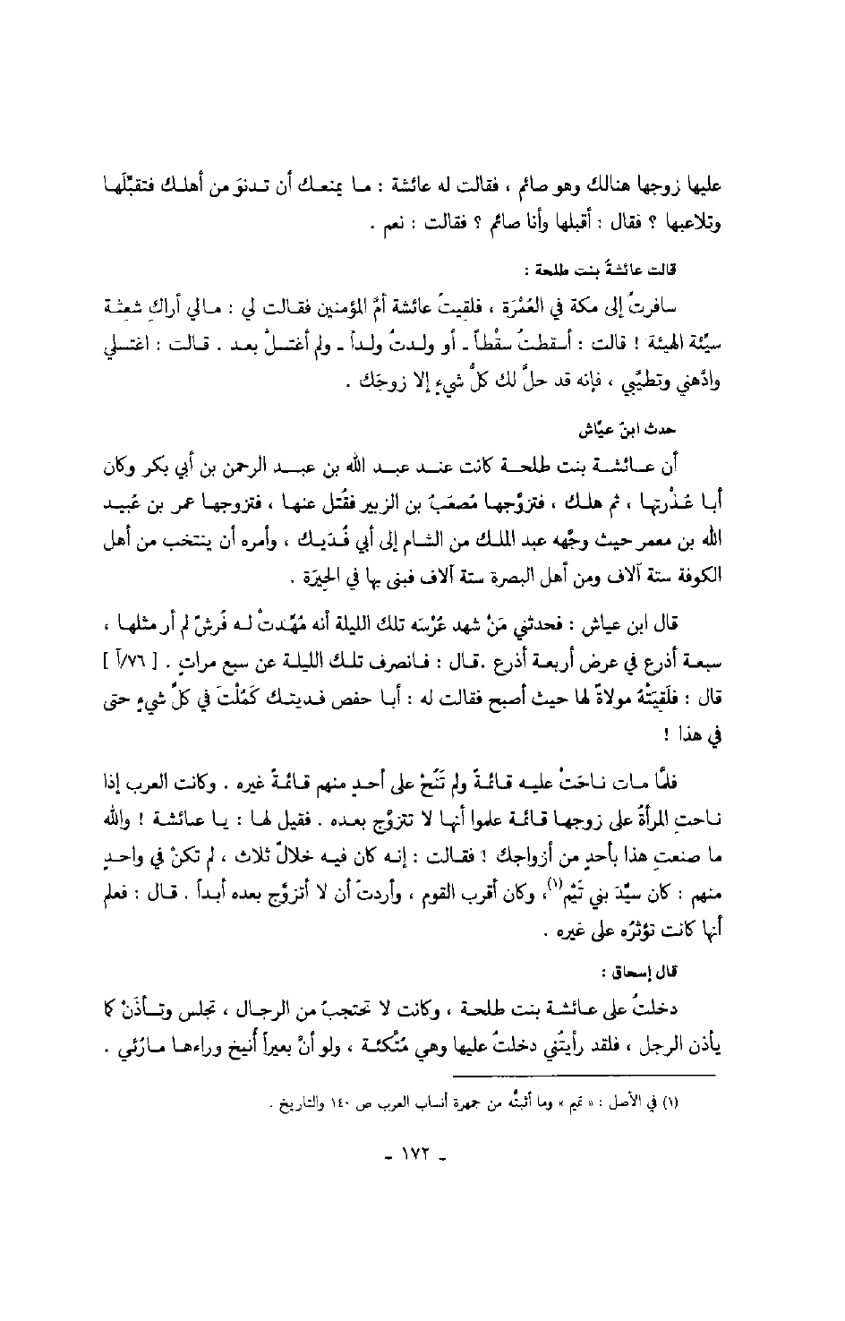 قال إسحاق: دخلت على عائشة بنت طلحة، وكانت لا تحتجب من الرجال، تجلس وتأذن كما يأذن الرجل، فلقد رأيتني دخلت عليها وهي متكئة، ولو أن بعيراً أنيخ وراءها مارئي.